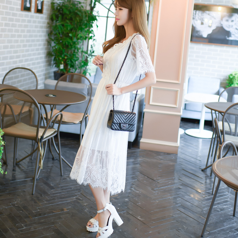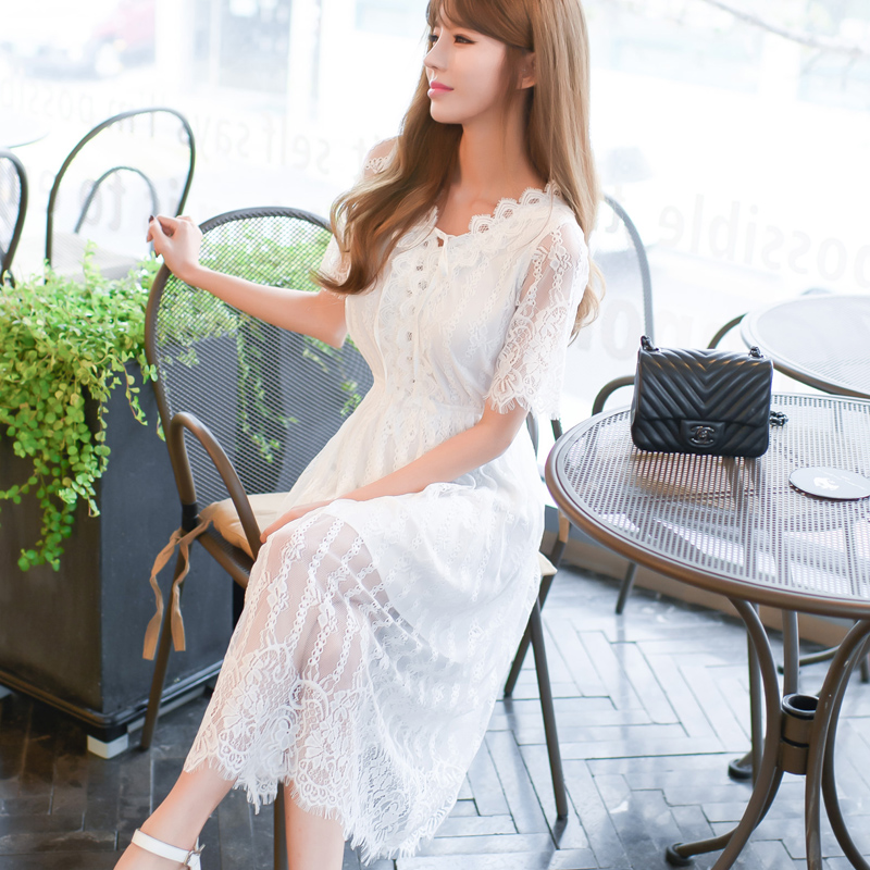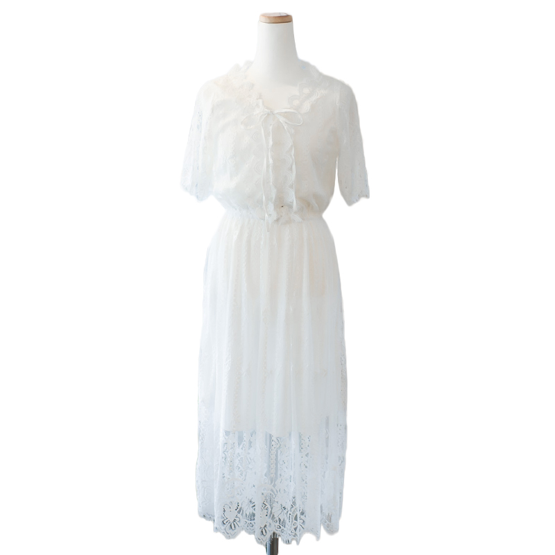 / 波西米亞仙氣長裙沙灘裙海邊度假顯瘦白色v領蕾絲連衣裙子夏