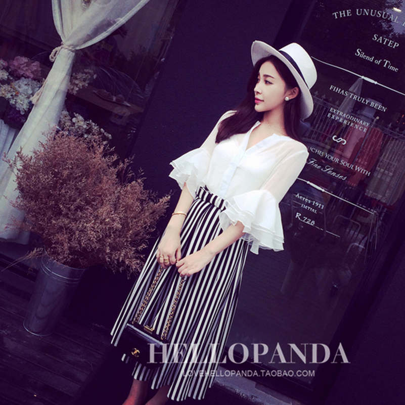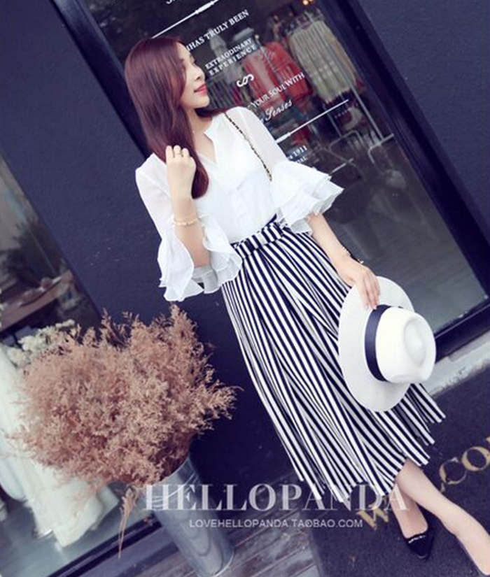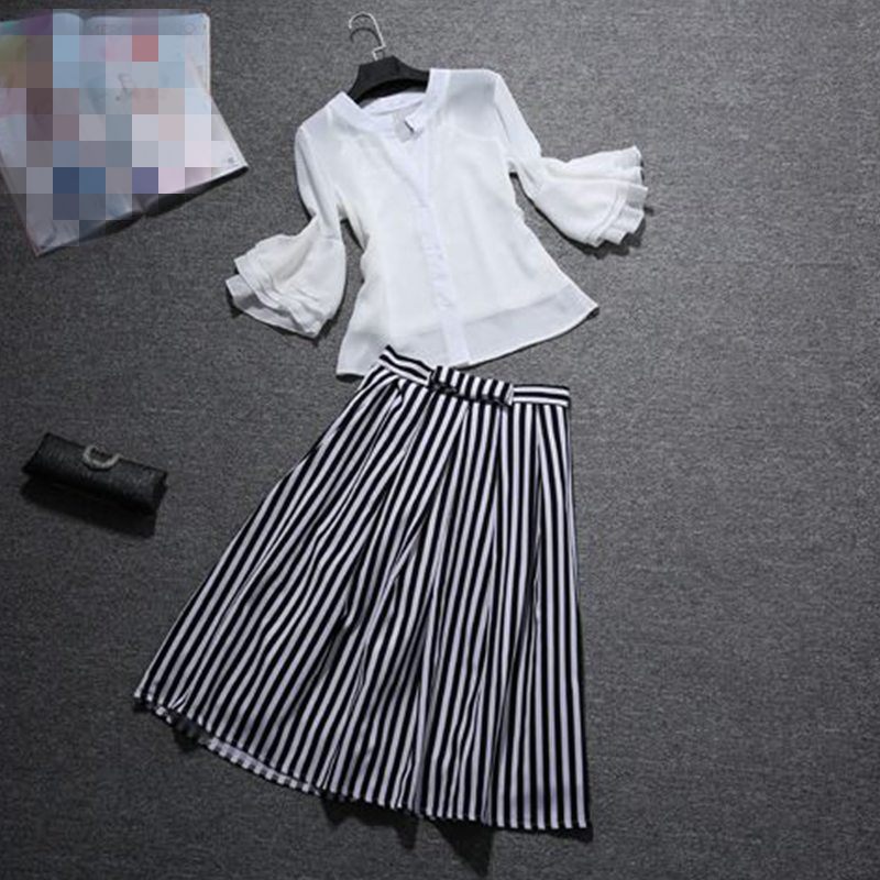 / 春夏季新款時尚套裝女氣質寬松雪紡襯衫條紋半身裙長裙兩件套