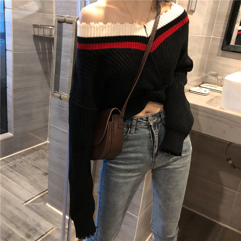 / 2018新款V領一字肩兩穿小心機復古chic交叉針織條紋撞色長袖毛衣