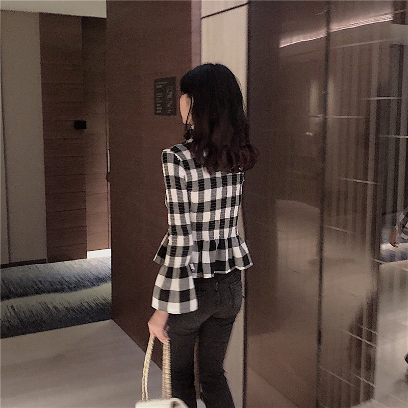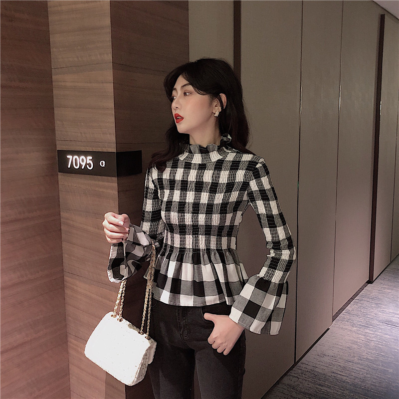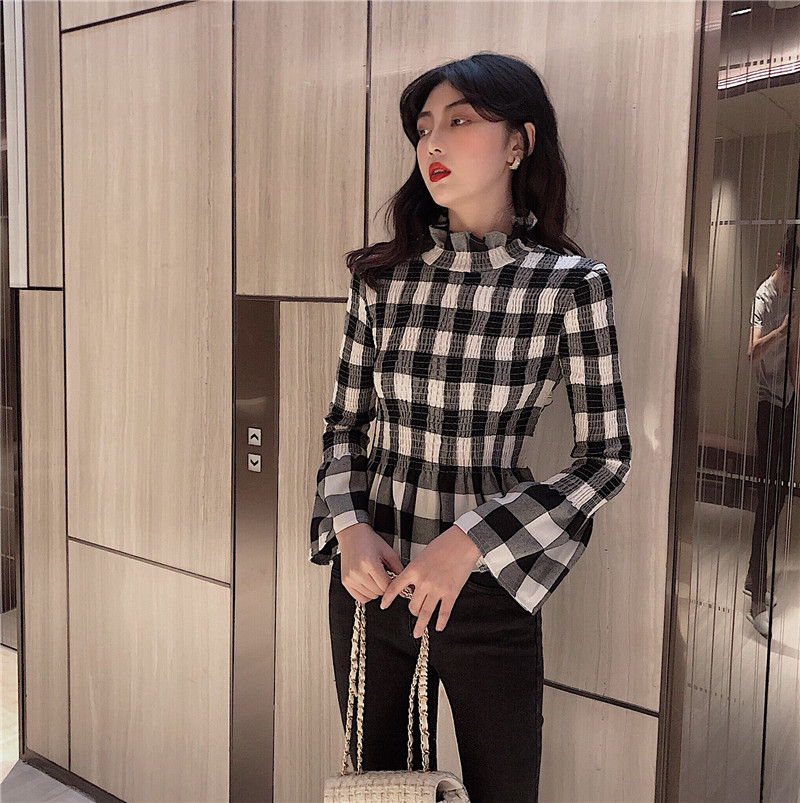 / chic秋冬新款韓版打底顯瘦氣質皺褶收腰修身高領喇叭袖格子上衣女