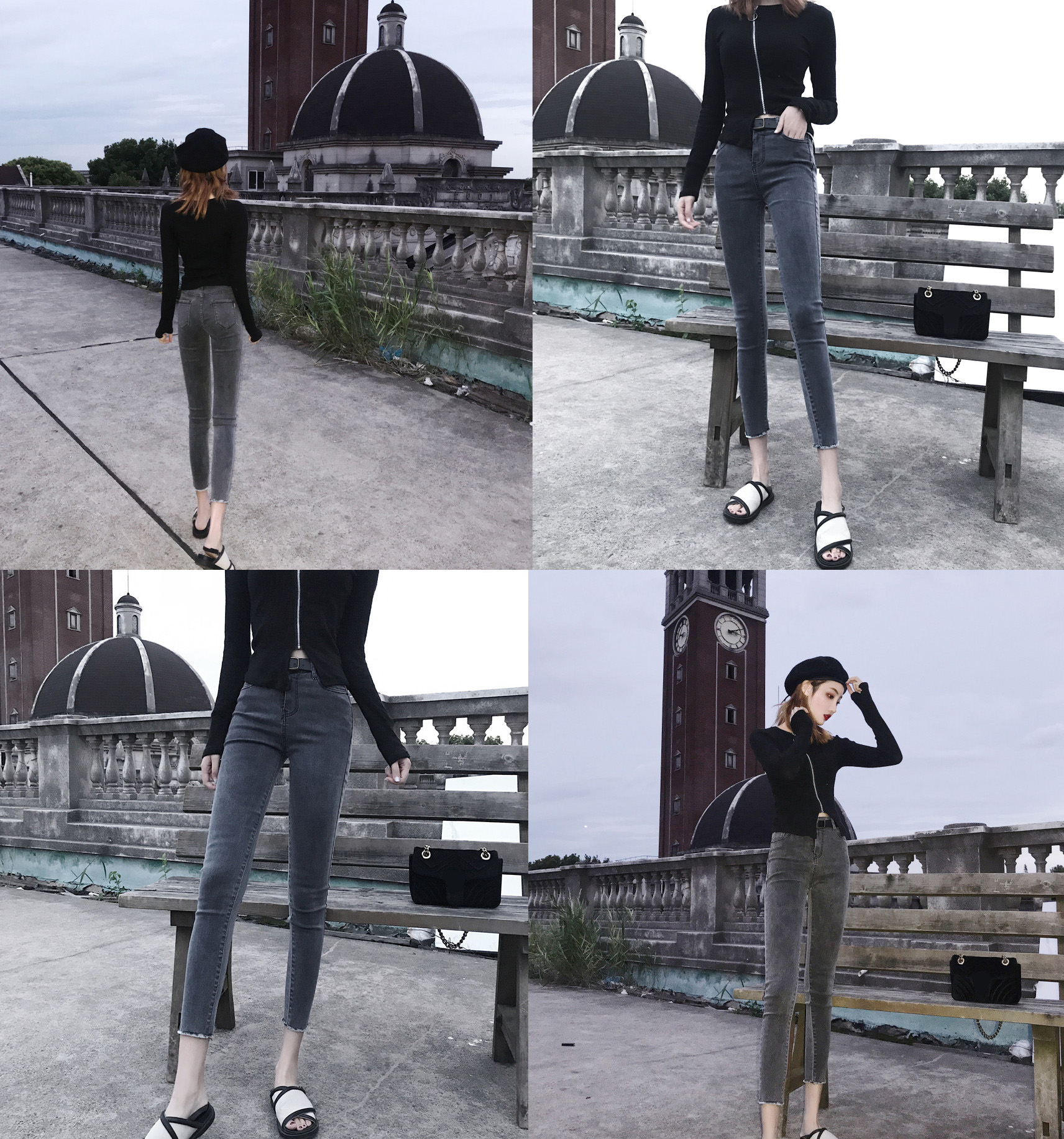 秋冬新款chic復古煙灰色破洞高腰顯瘦毛邊牛仔小腳褲鉛筆褲九分褲