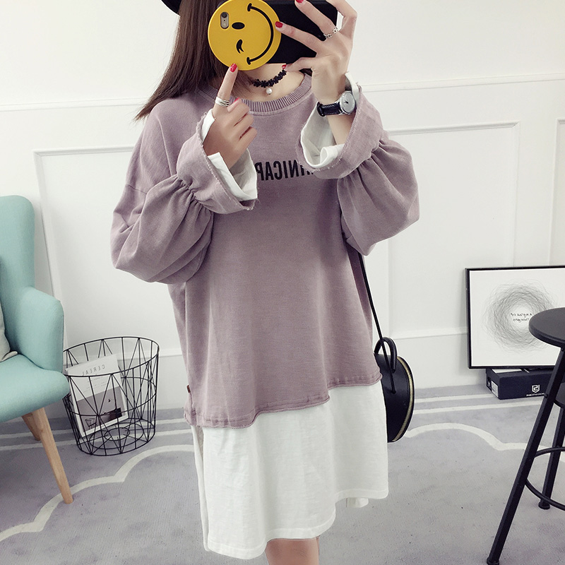 / 喇叭袖假兩件連衣裙女春秋新款韓版寬松顯瘦百搭春款打底衫夏