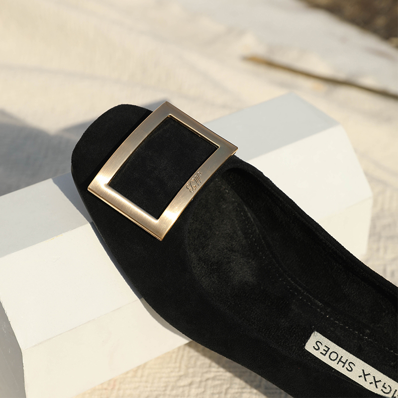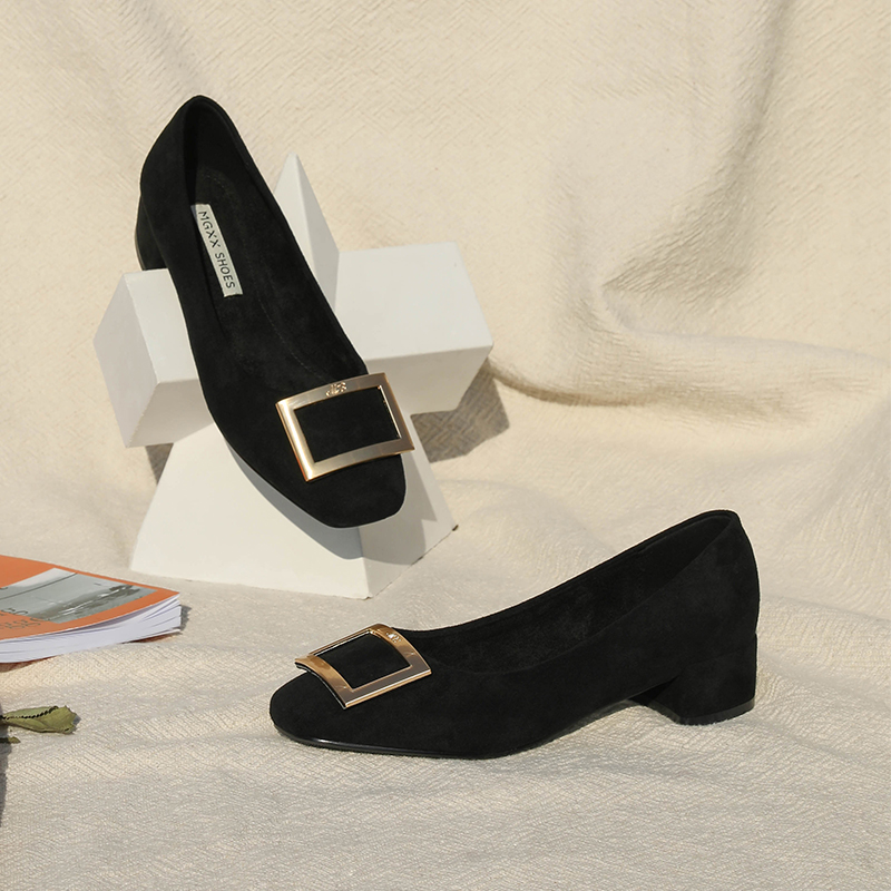 MG小象中跟淺口女鞋冬季時尚單鞋2018新款金屬方扣黑色粗跟高跟鞋