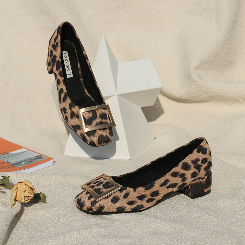 / MG小象中跟淺口女鞋冬季時尚單鞋2018新款金屬方扣黑色粗跟高跟鞋