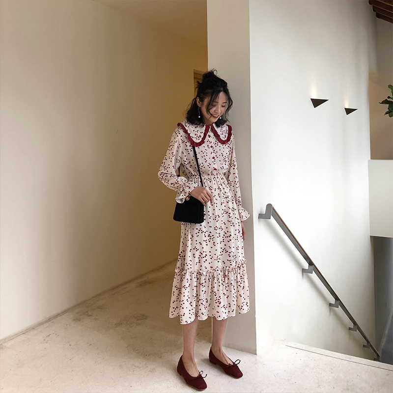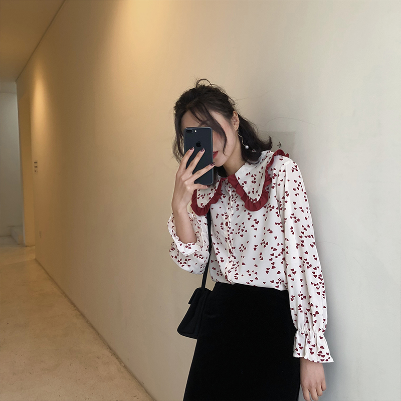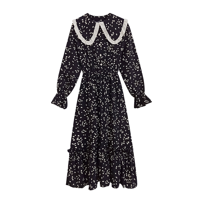 A7seven襯衫連衣裙女春中長款A字長袖韓版寬松顯瘦黑色荷葉邊襯衣