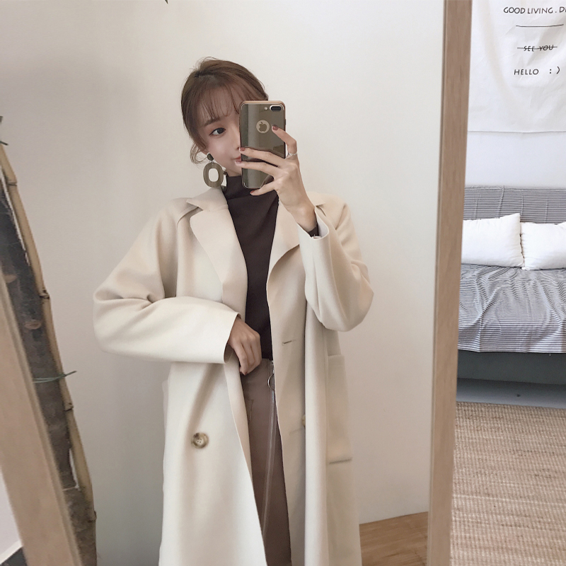 / 秋冬韓版氣質長袖毛呢外套新款時尚chic中長款過膝妮子大衣送腰帶