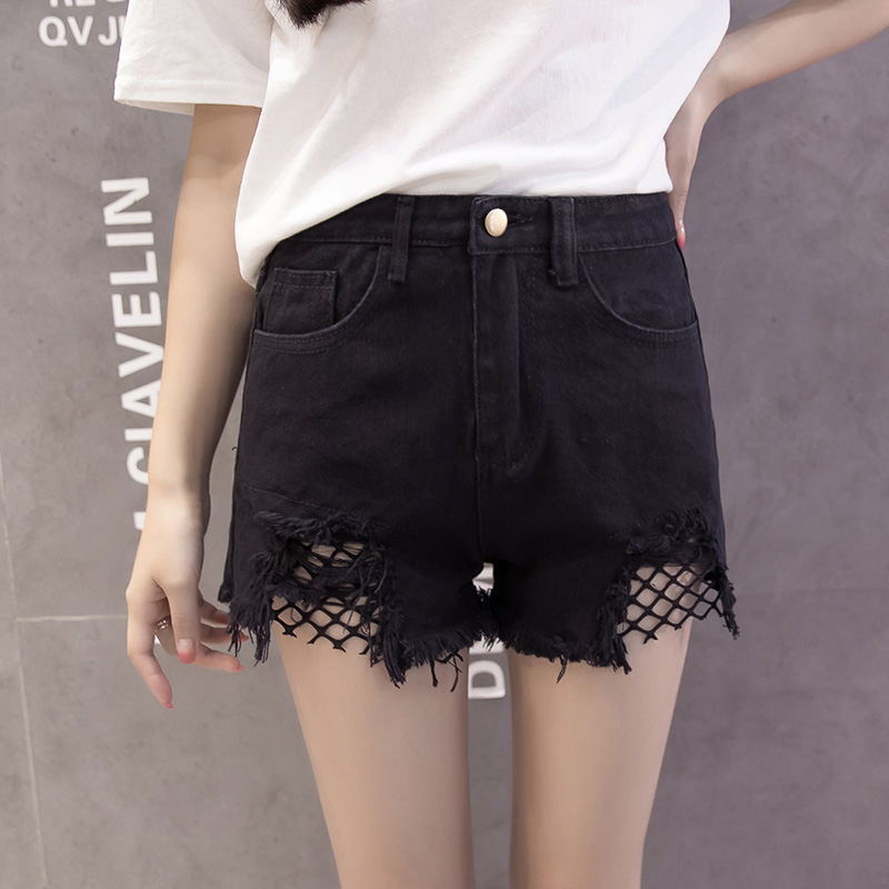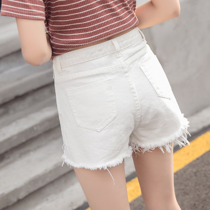夏季韓版破洞牛仔短褲女漁網磨破毛邊闊腿褲白色大碼學生熱褲