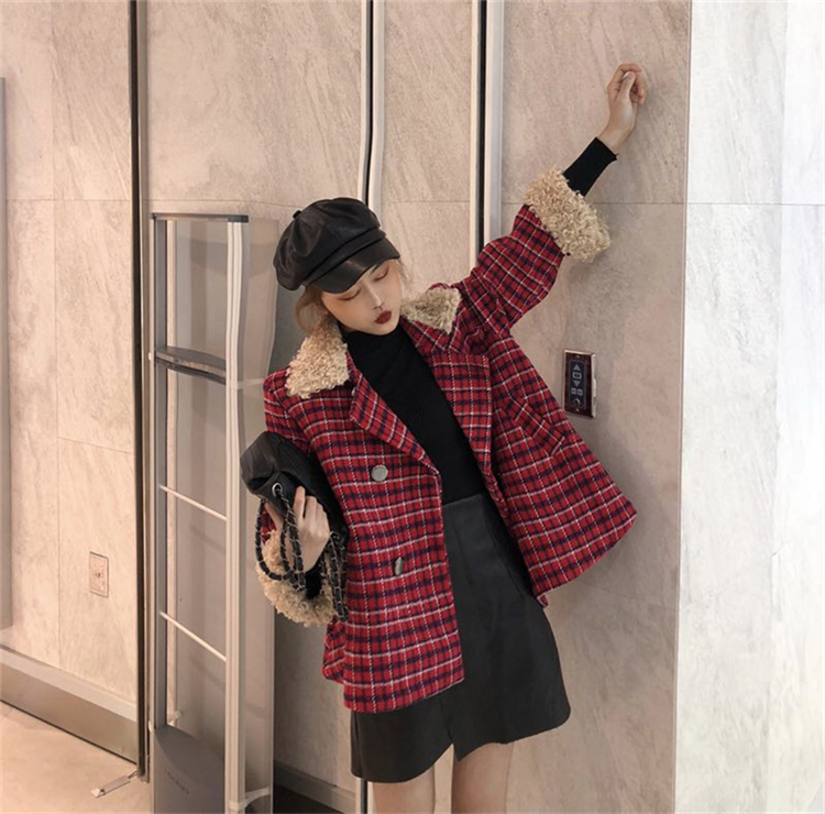 / 2018秋裝新款韓版雙排扣翻領格子大衣毛呢半高領修身打底T恤套裝