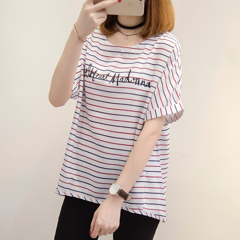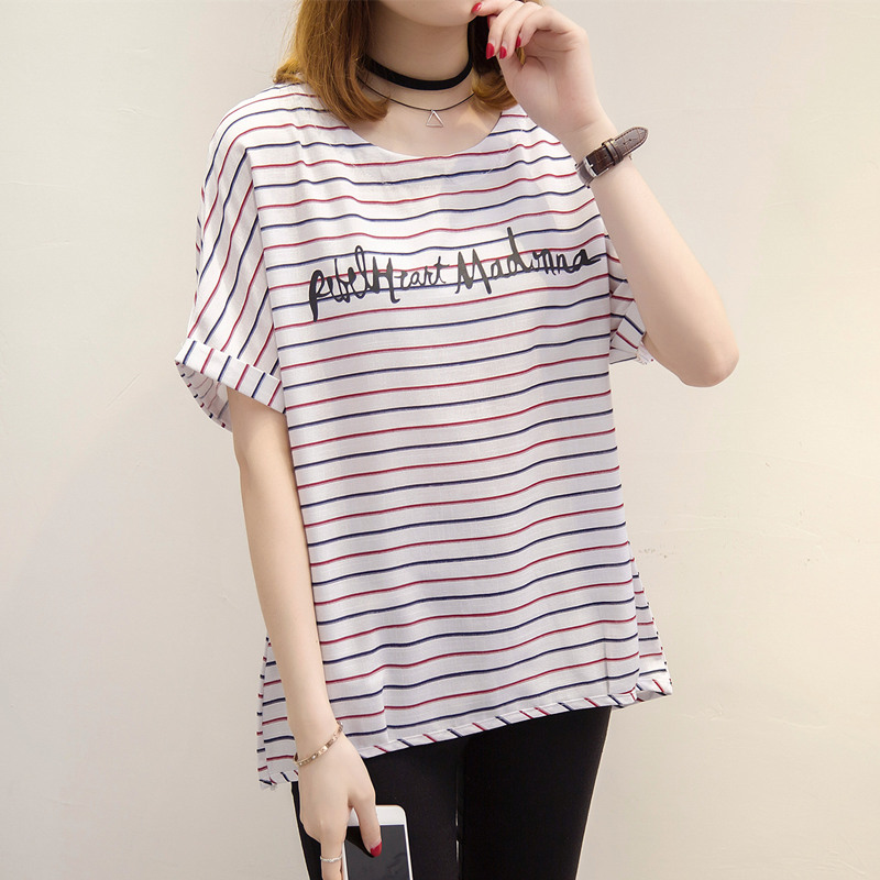夏裝新款女條紋t恤女寬松小清新上衣體恤衫短袖韓版衣服女夏