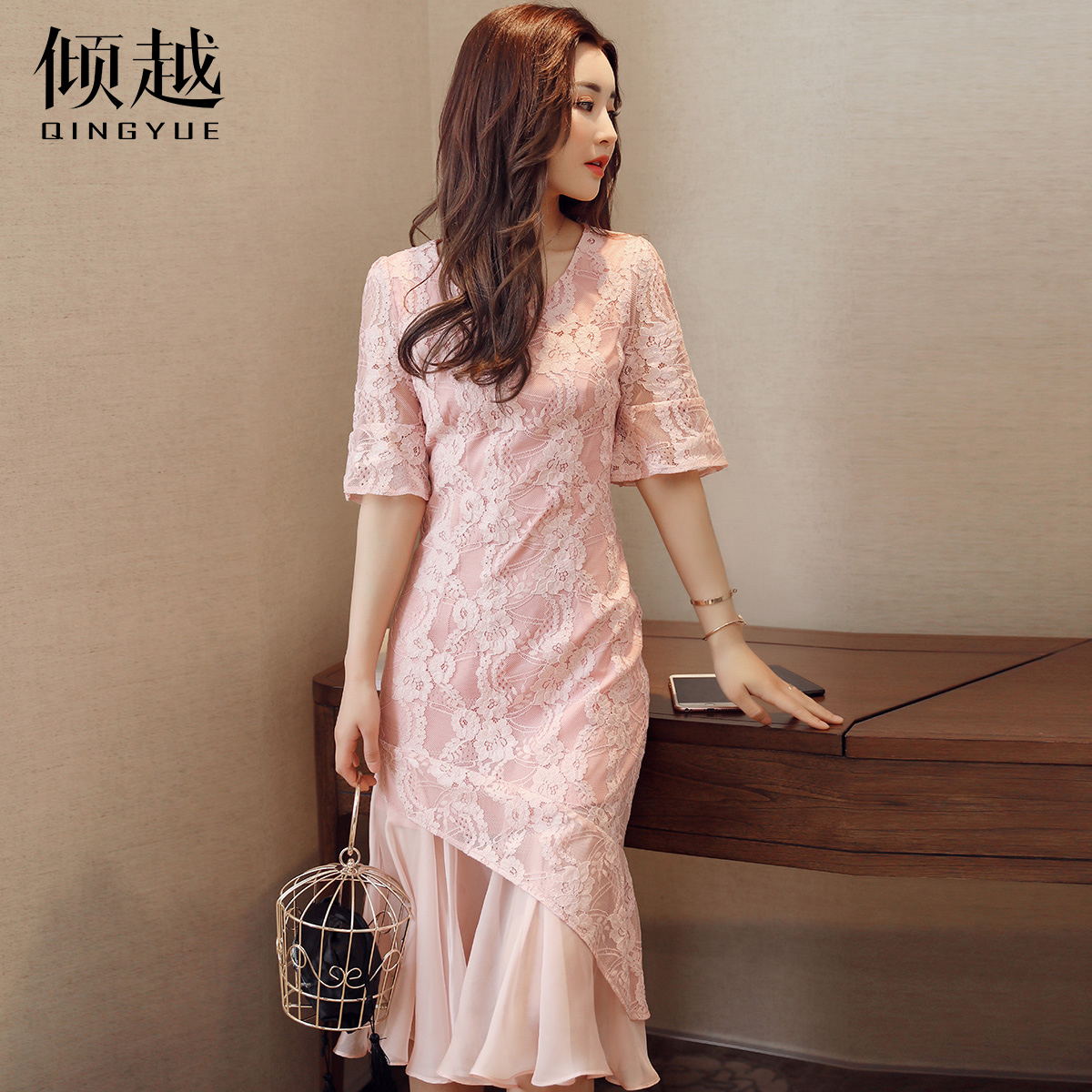 / 傾越2017夏季喇叭袖修身淑女顯瘦鏤空包臀收腰中長款蕾絲連衣裙潮