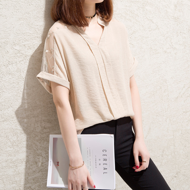 / 白色t恤女小清新露肩上衣bf風V領網紗寬松體恤短袖女夏裝新款
