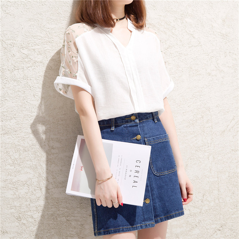 白色t恤女小清新露肩上衣bf風V領網紗寬松體恤短袖女夏裝新款