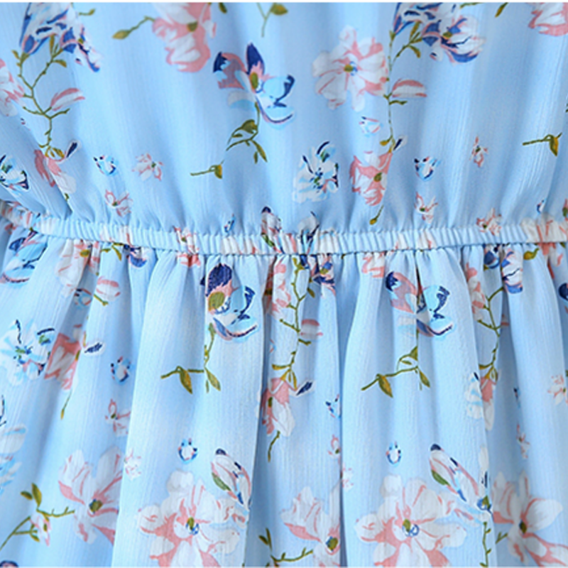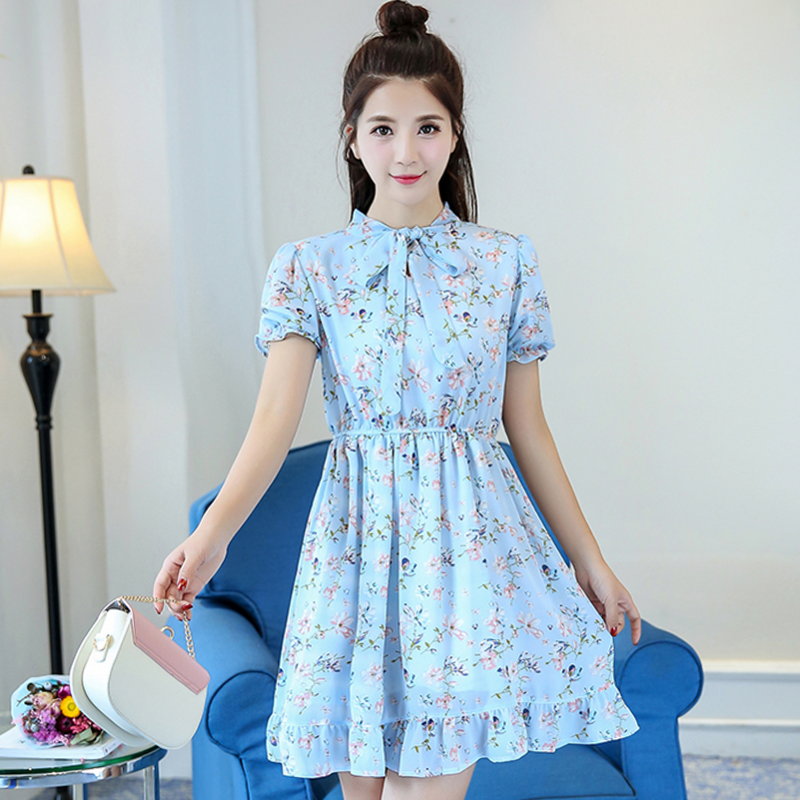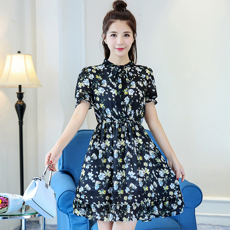 / 夏季女裝新款時尚修身韓版碎花雪紡a字連衣裙收腰中長款短袖
