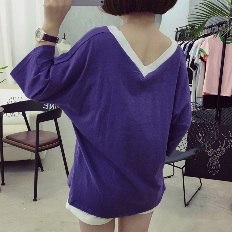 / 早春裝新款竹節棉七分袖t恤女白色V領寬松體恤潮顯瘦大碼上衣