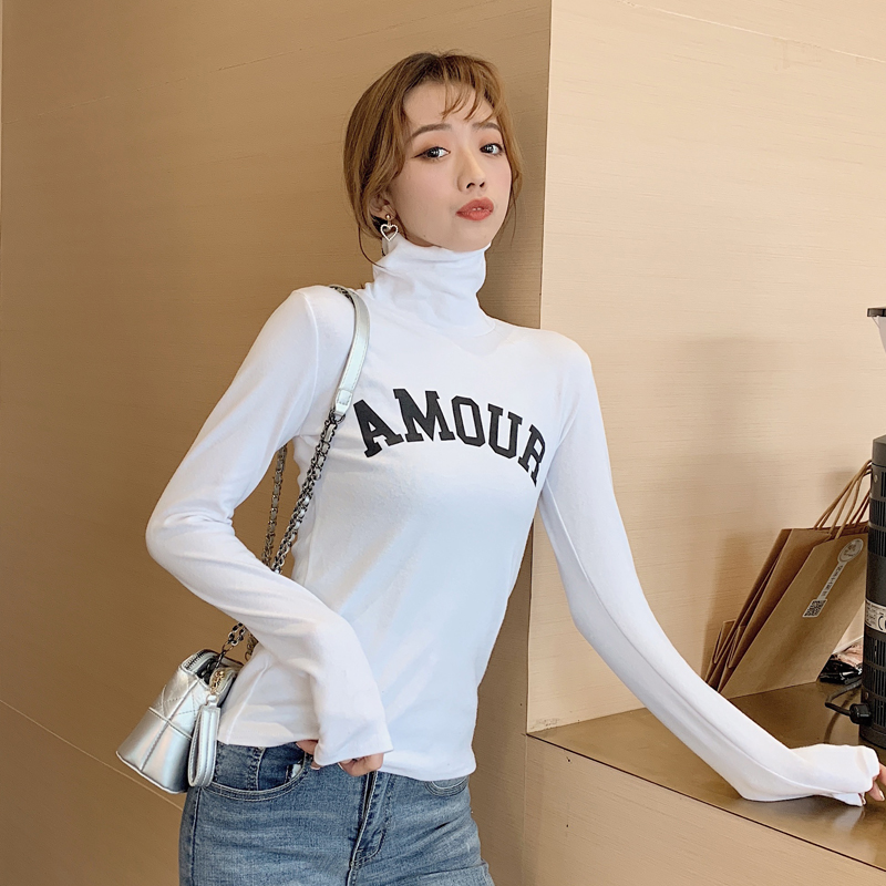港味秋冬高領長袖字母印花T恤女顯瘦修身上衣磨毛加厚高領打底衫