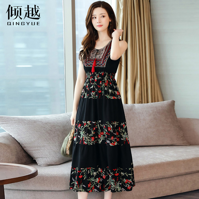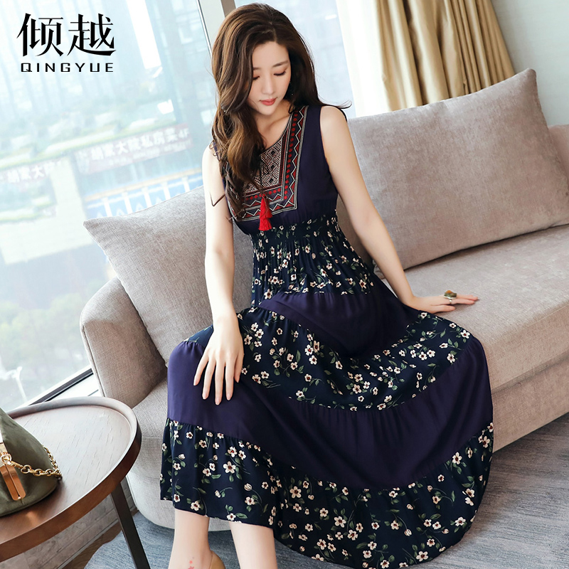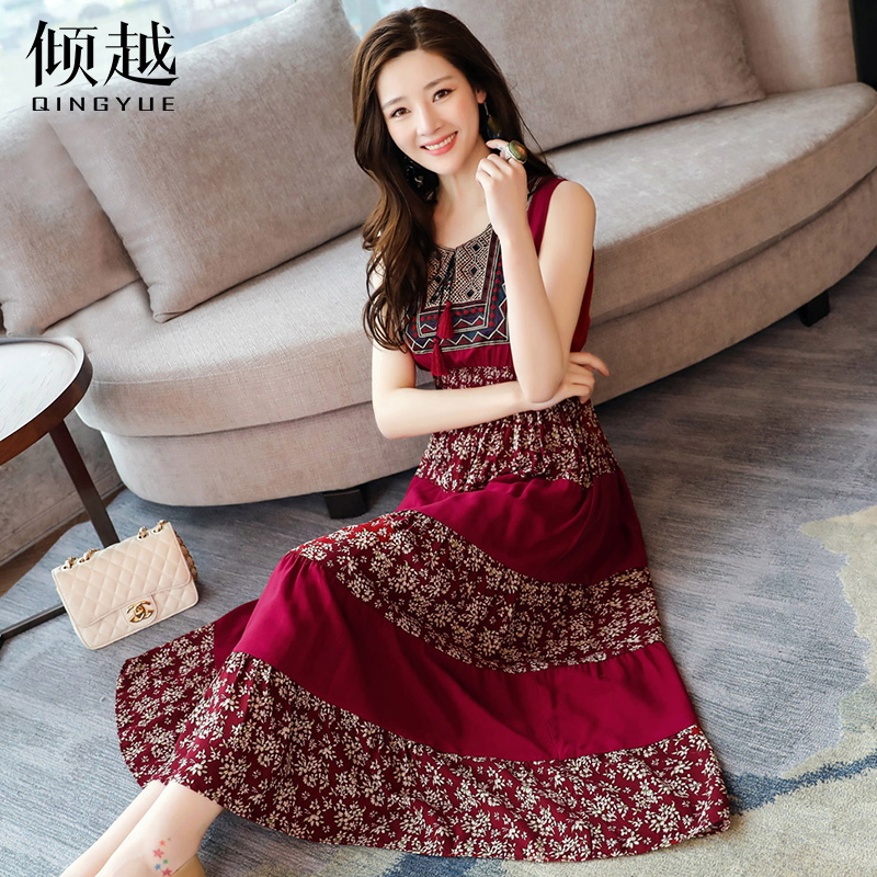/ 傾越韓版文藝顯瘦長裙女2017春裝新款無袖復古印花系帶大擺A字裙