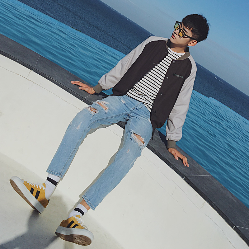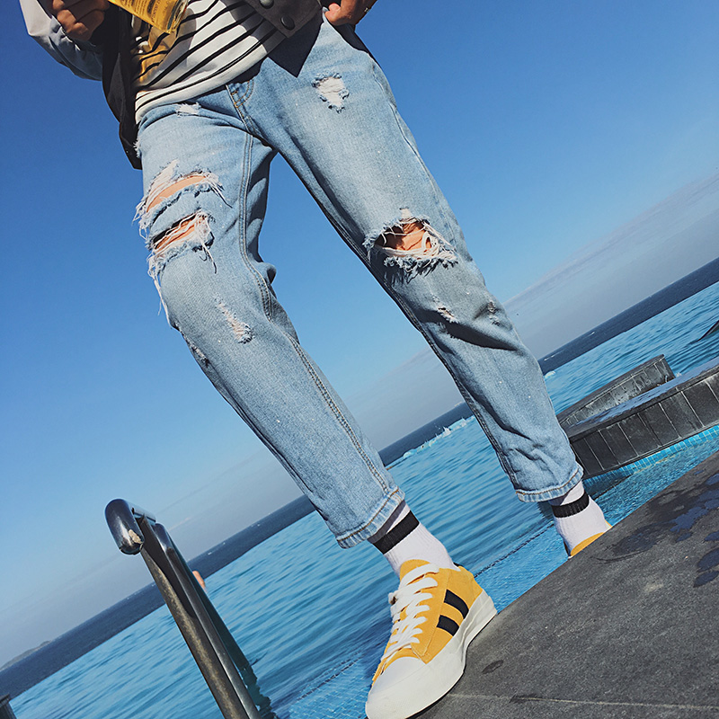 男裝破洞水洗修身小直腳男士九分褲春季潮男牛仔褲
