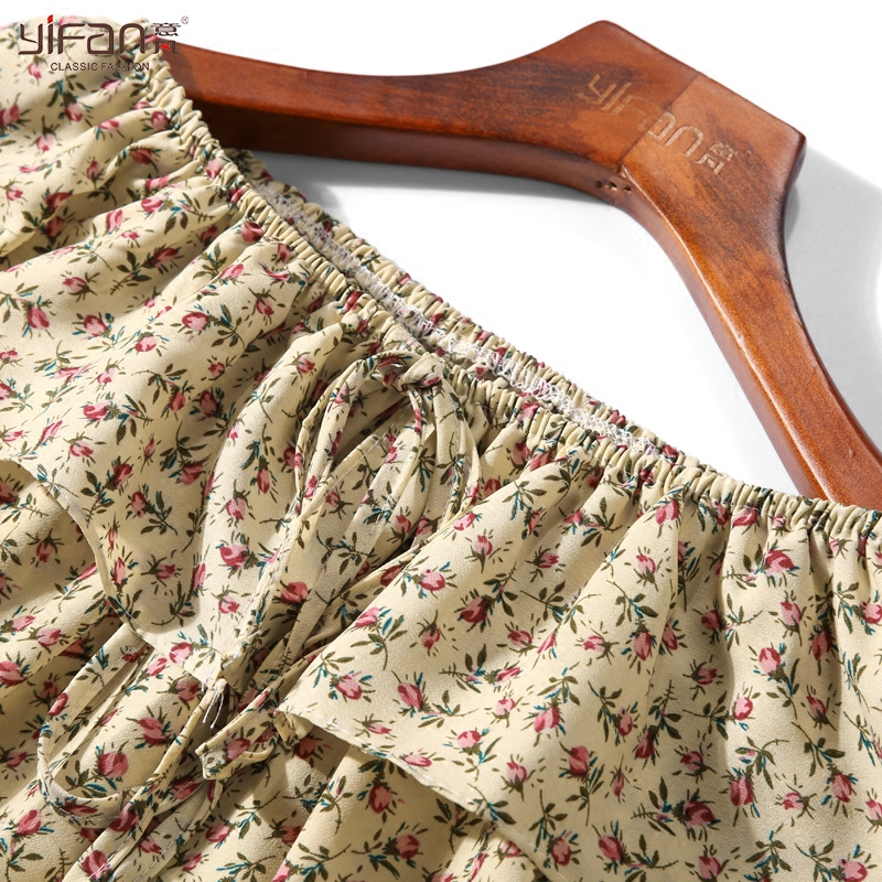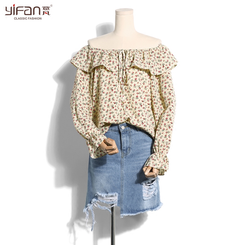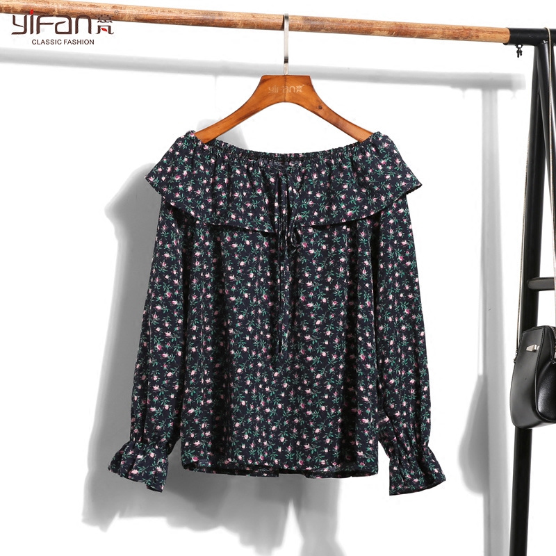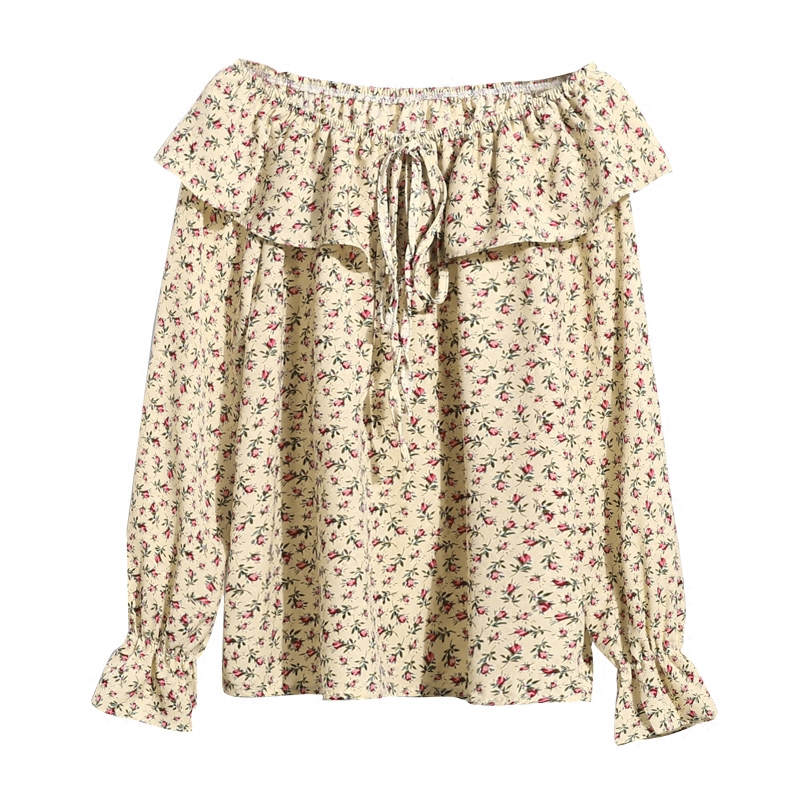 / 春夏季新款韓版碎花雪紡衫長袖一字肩喇叭袖印花露肩雪紡上衣