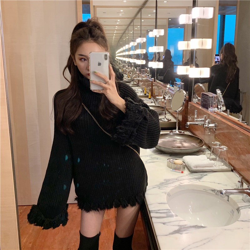 秋冬新款韓版時尚保暖甜美上衣慵懶寬松加厚高領拼接流蘇針織毛衣
