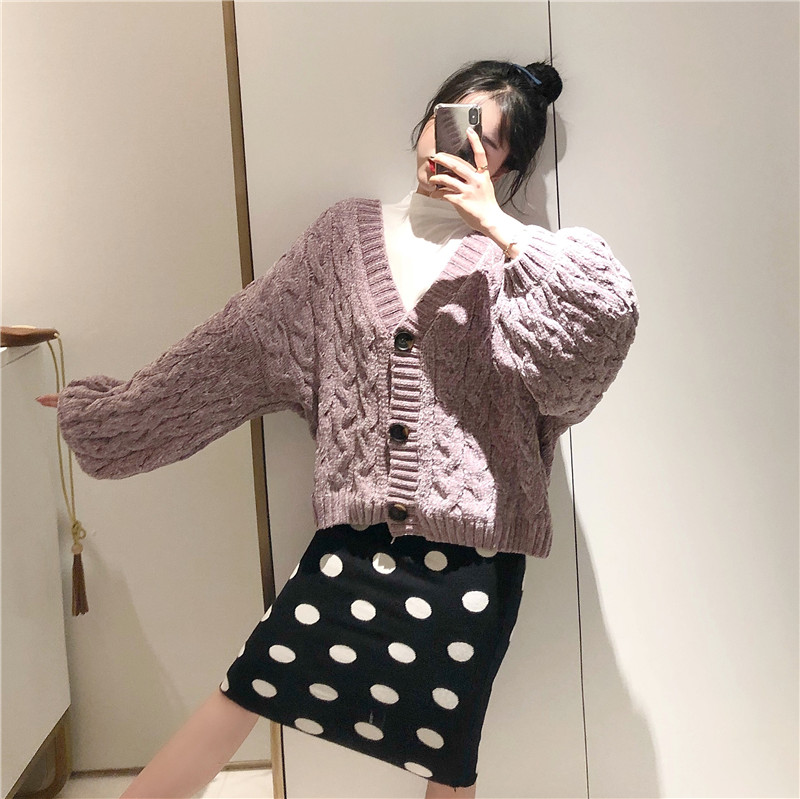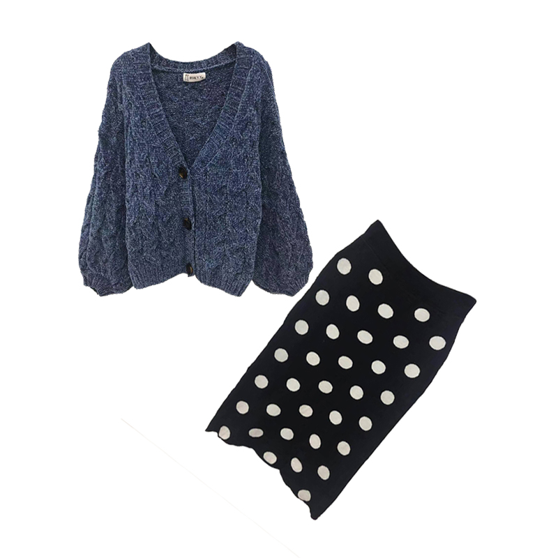 / 港味新款韓版時尚套裝短款麻花毛衣開衫兩件套女裝波點針織半身裙