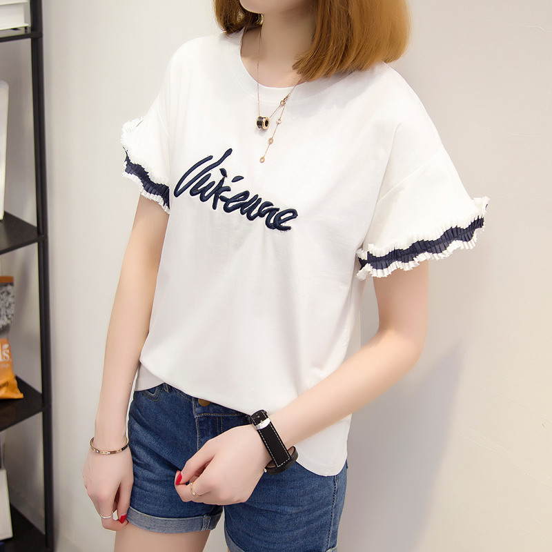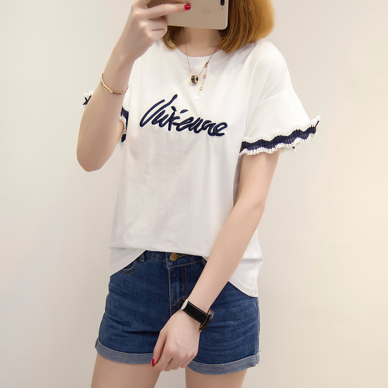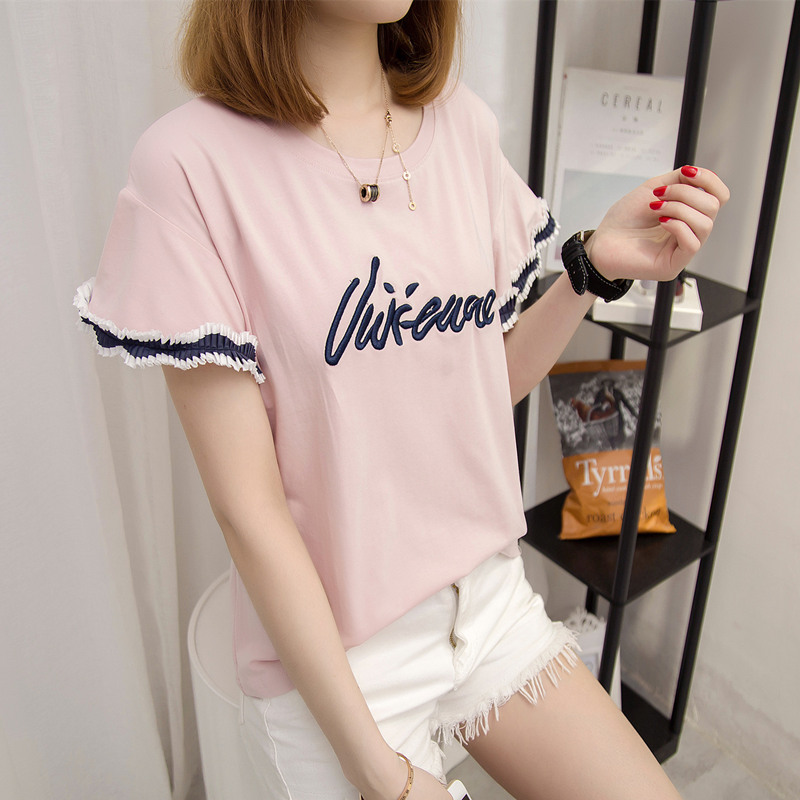 / 女裝夏裝新款韓版潮寬松字母百搭上衣女圓領短袖體恤衫打底衫