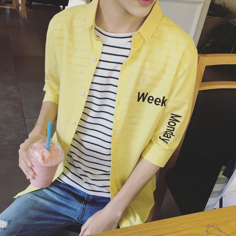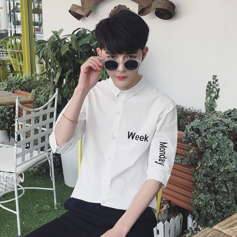 / 原創日韓字母繡花小清新男士修身七分袖襯衫
