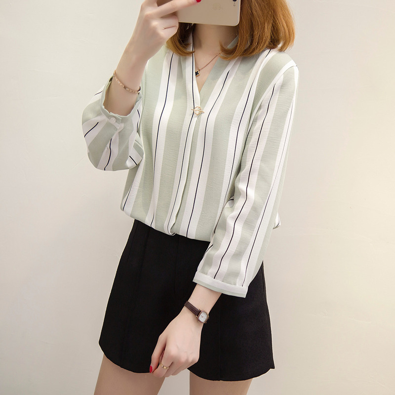 條紋襯衫女V領韓風chic小清新上衣白襯衣女長袖夏裝新款韓范