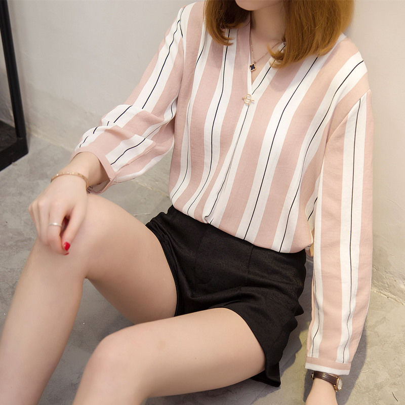/ 條紋襯衫女V領韓風chic小清新上衣白襯衣女長袖夏裝新款韓范