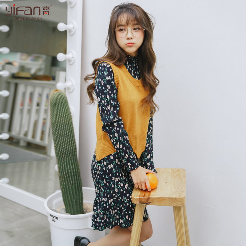 / 春裝雪紡碎花寬松中長款連衣裙針織毛衣背心馬甲兩件套女裝