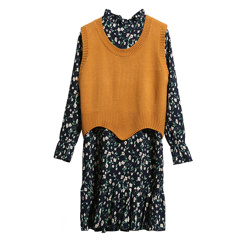 春裝雪紡碎花寬松中長款連衣裙針織毛衣背心馬甲兩件套女裝