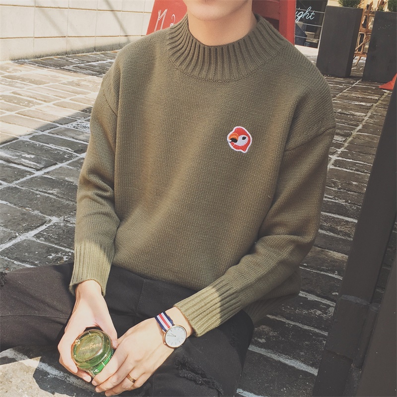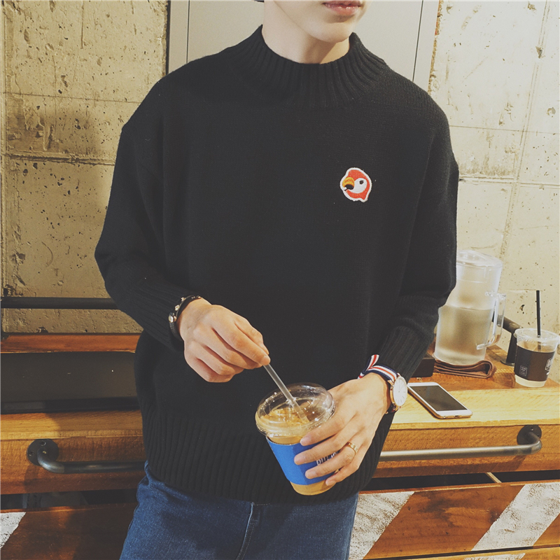 男裝新款冬裝卡通小鳥繡花韓版插肩袖半高領男士圓領毛衣