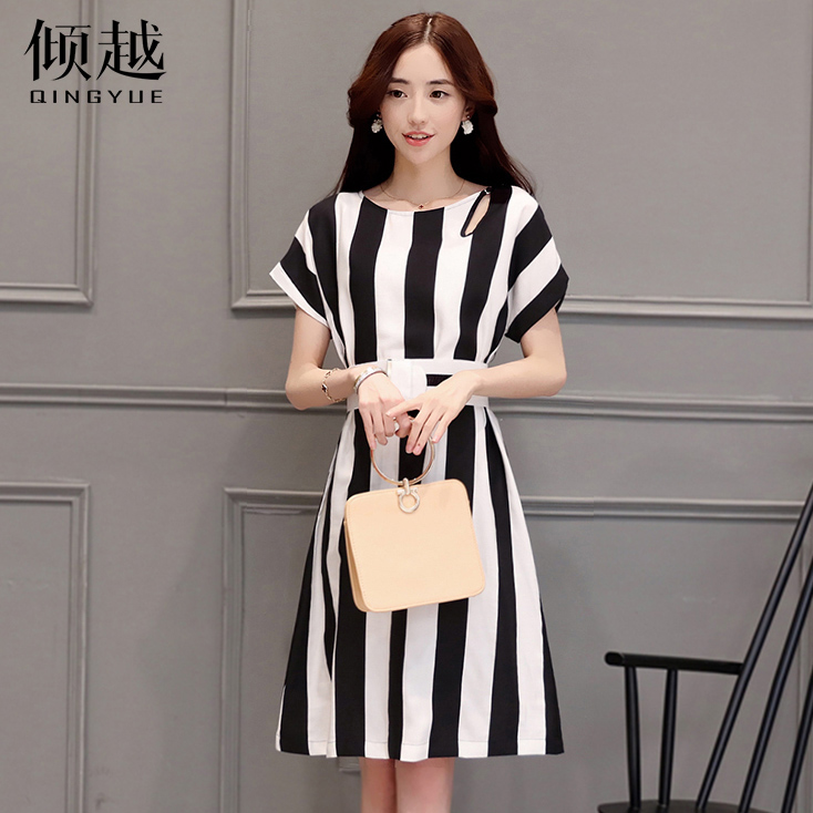 傾越2017夏季女裝新款韓版修身連衣裙百搭條紋短袖連衣裙女收腰潮