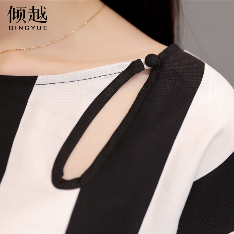 / 傾越2017夏季女裝新款韓版修身連衣裙百搭條紋短袖連衣裙女收腰潮