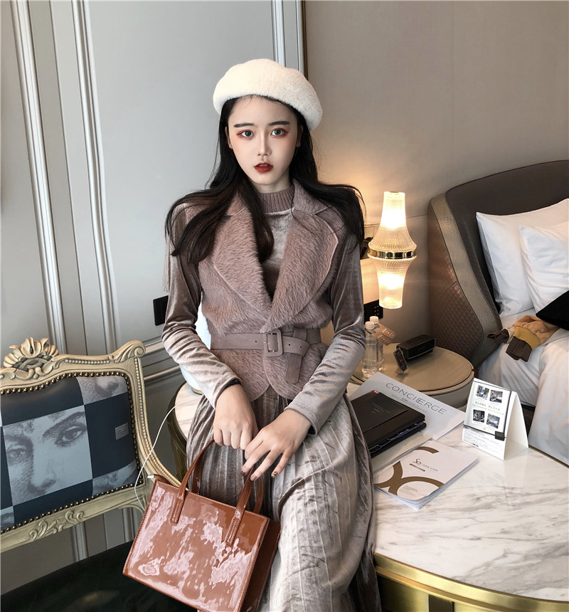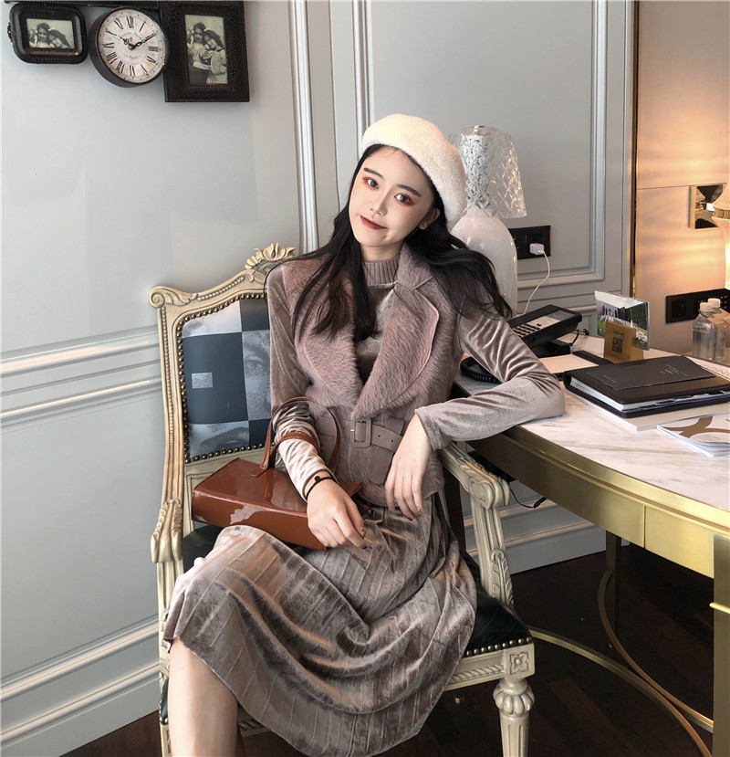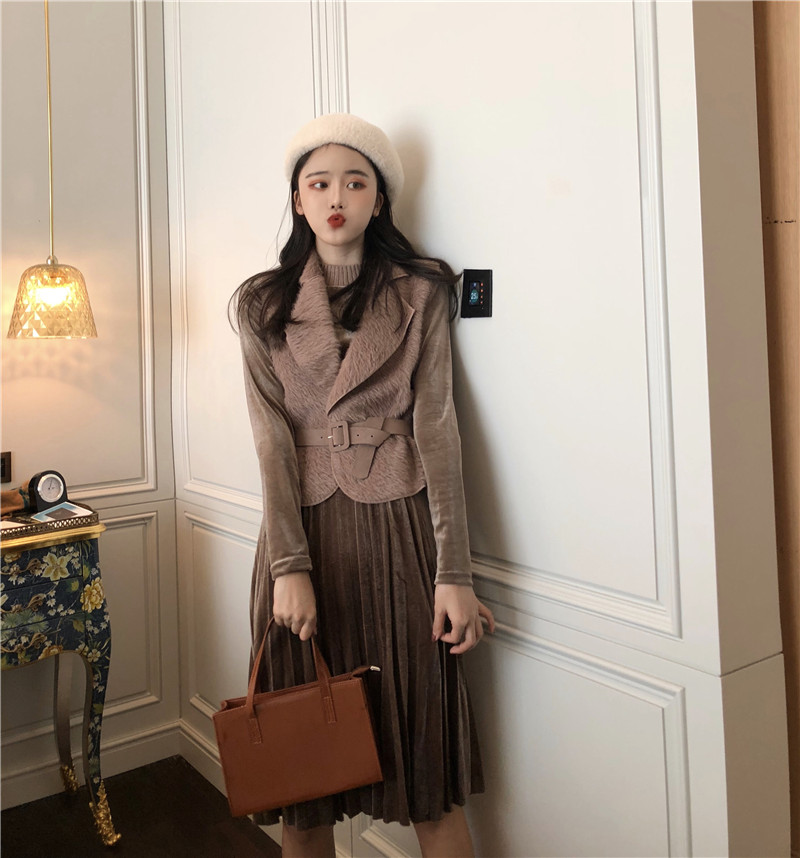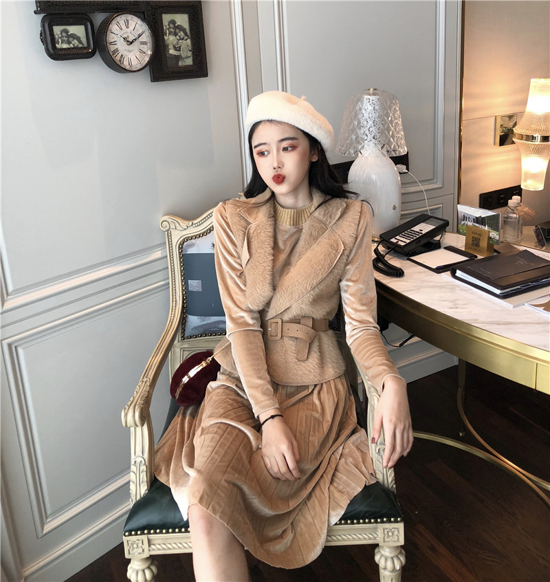 / 秋冬新款復古時尚套裝壓褶收腰連衣裙港風百搭小馬甲氣質兩件套女