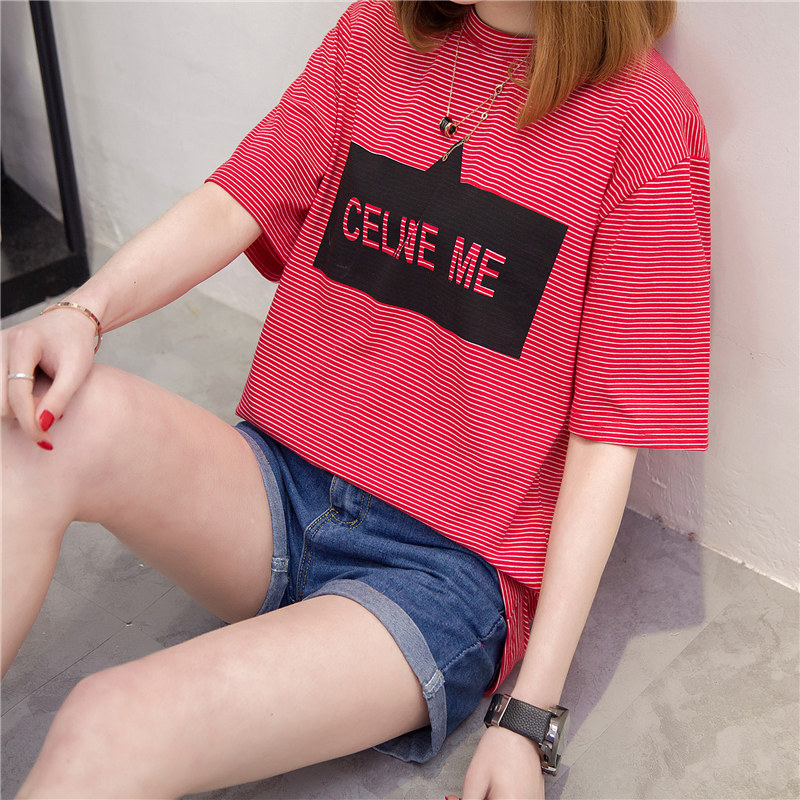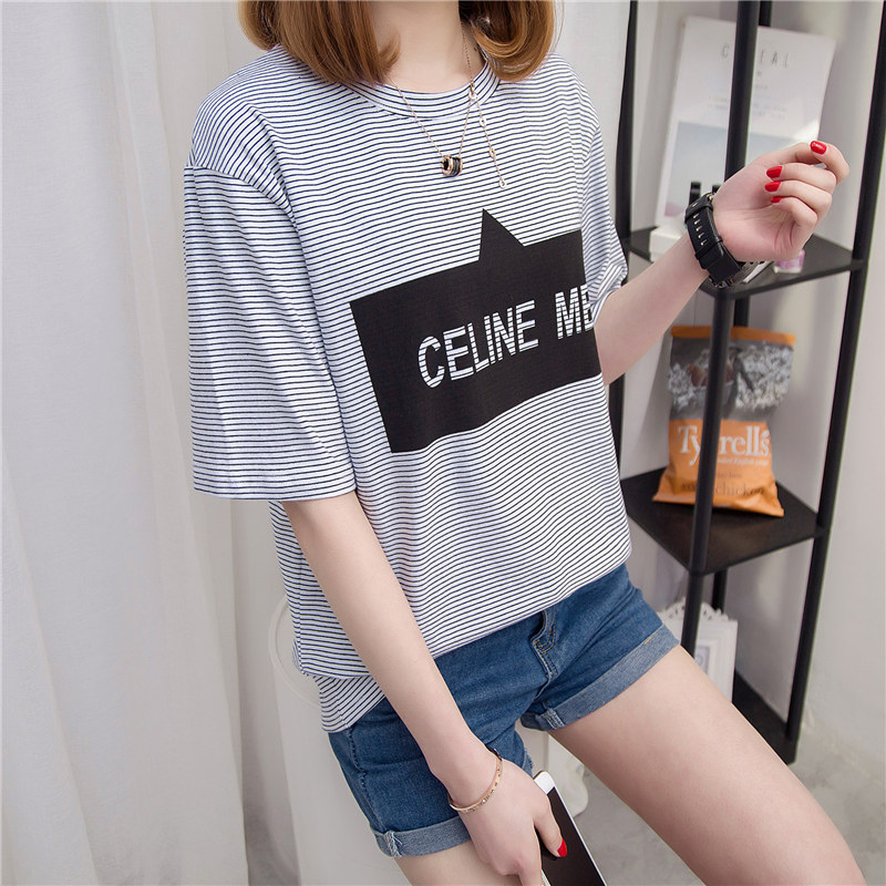 / 條紋t恤女短袖上衣女夏新款潮字母體恤女春裝韓版打底衫百搭