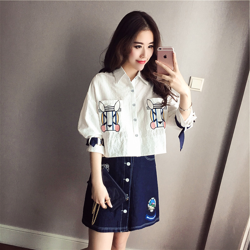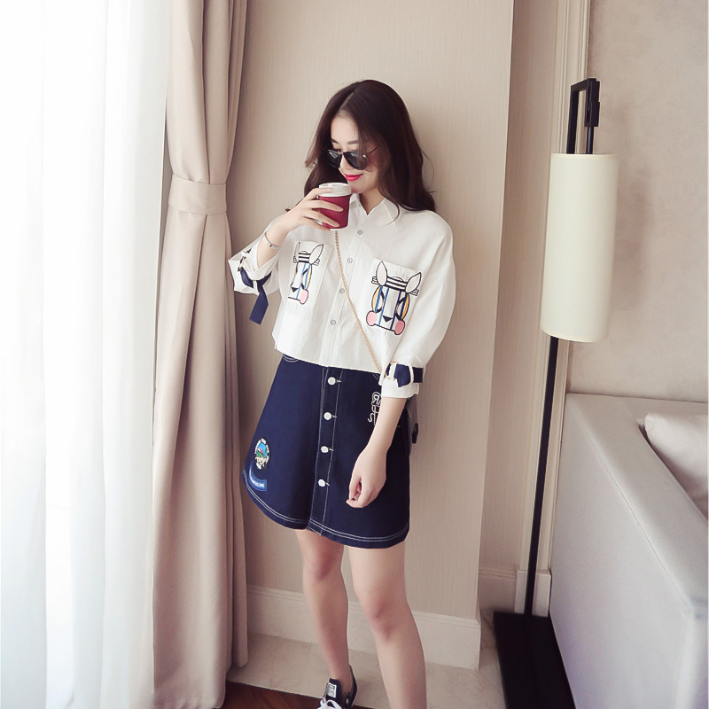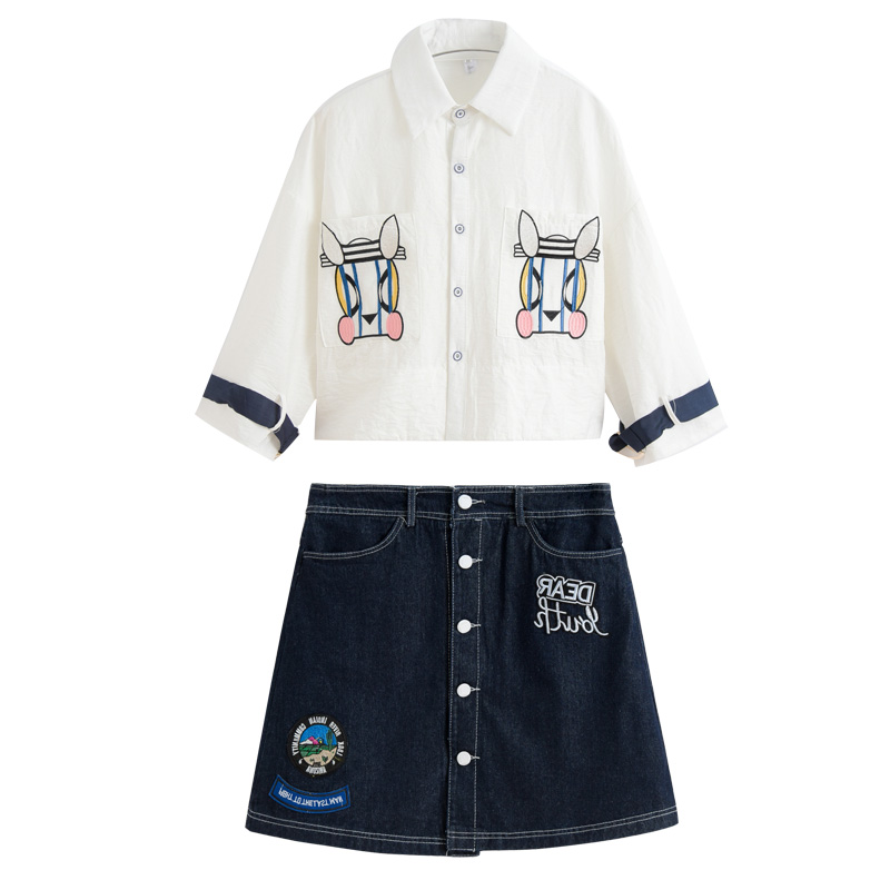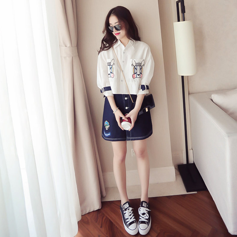/ 春夏裝韓版新款套裝女七分袖刺繡襯衣+牛仔短裙時尚兩件套連衣裙