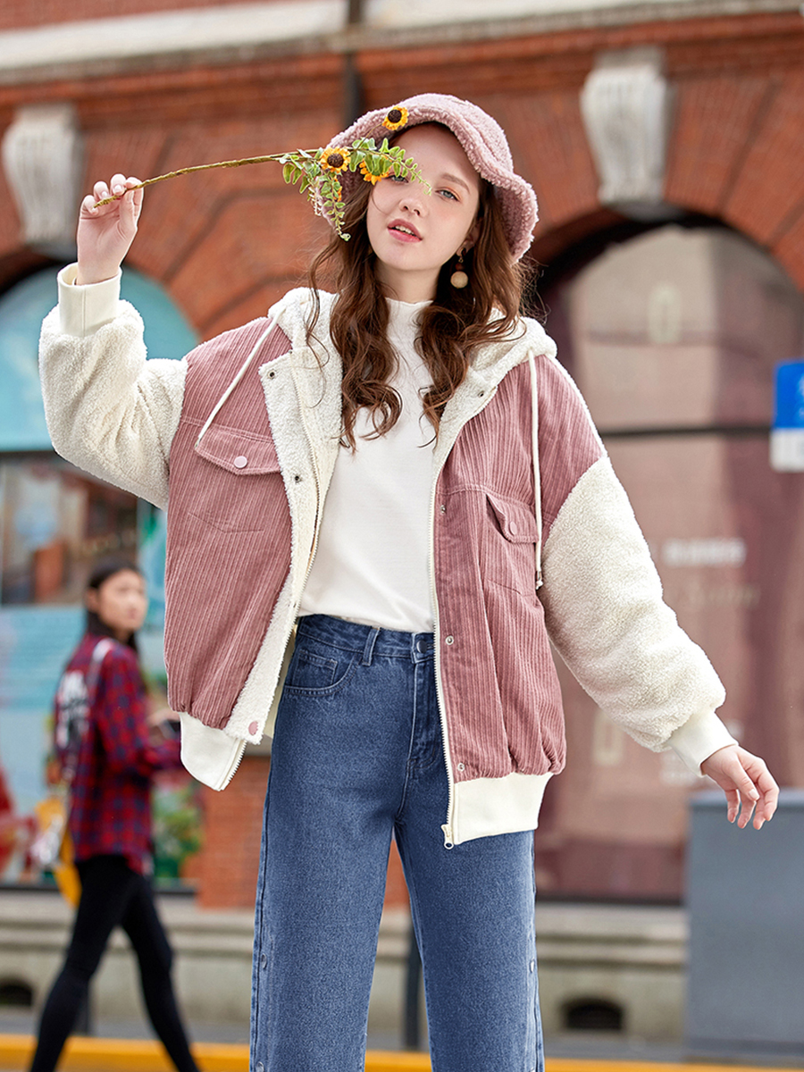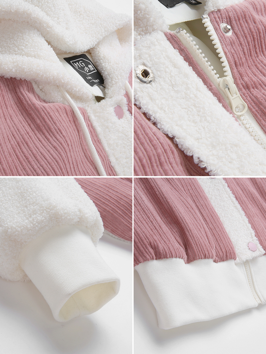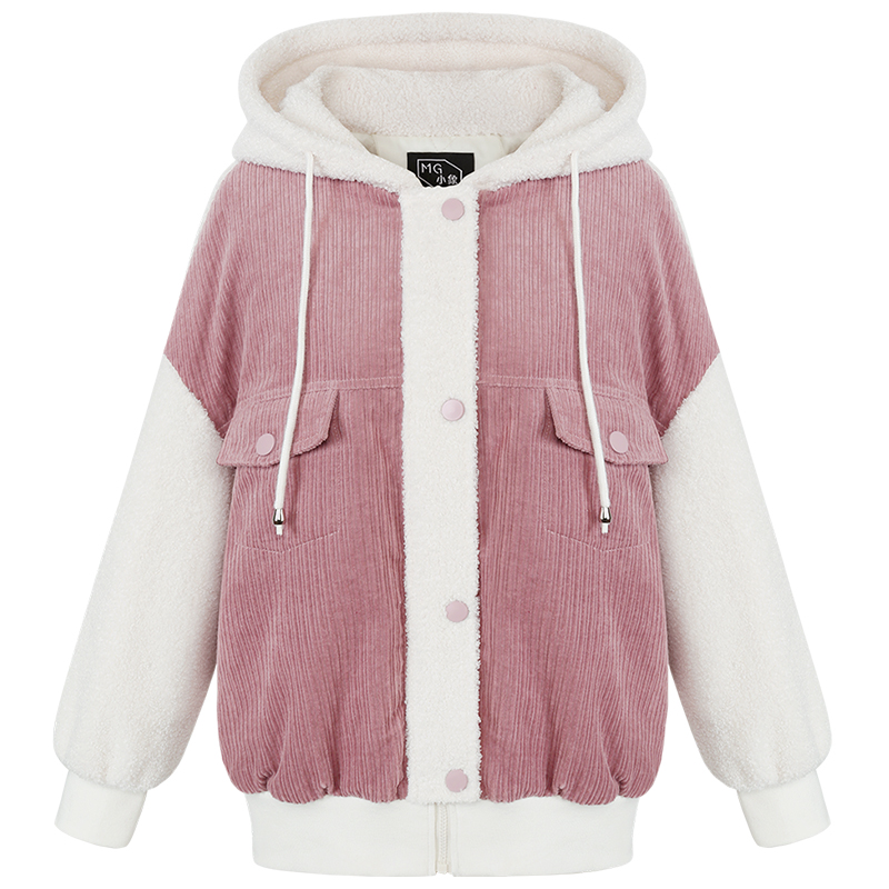 MG小象粉色加絨短外套女學院風秋冬2018新款韓版學生寬松連帽上衣