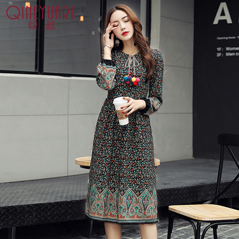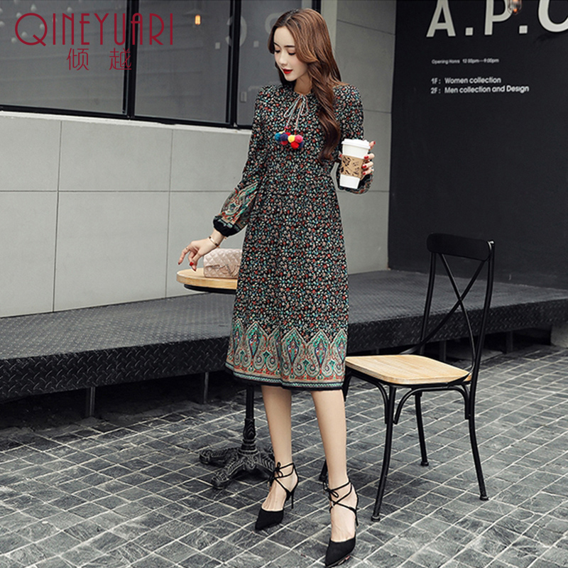/ 傾越2017春季新款修身小碎花色雪紡連衣裙女裝長袖中長款打底裙子