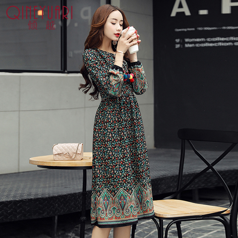 傾越2017春季新款修身小碎花色雪紡連衣裙女裝長袖中長款打底裙子