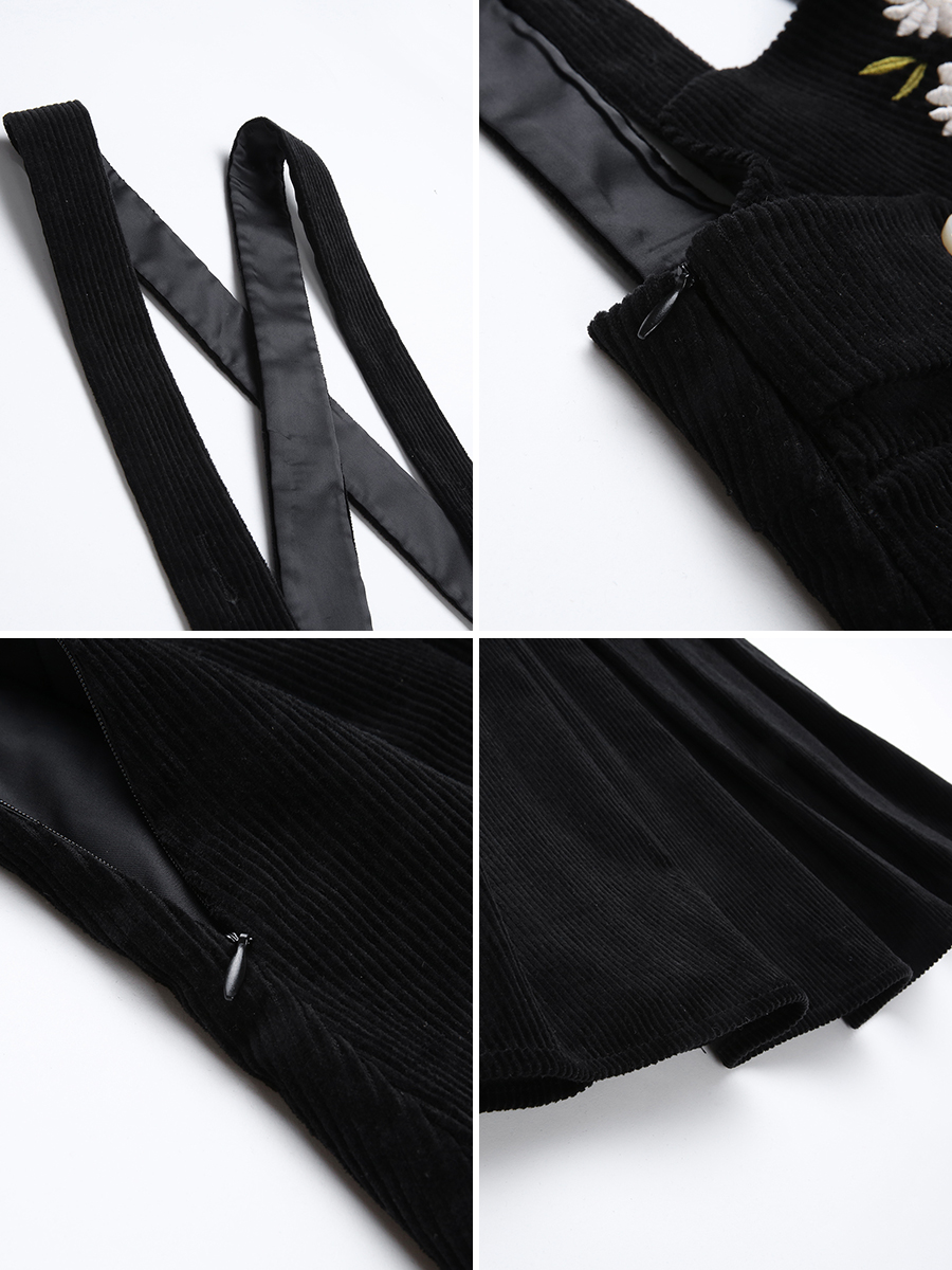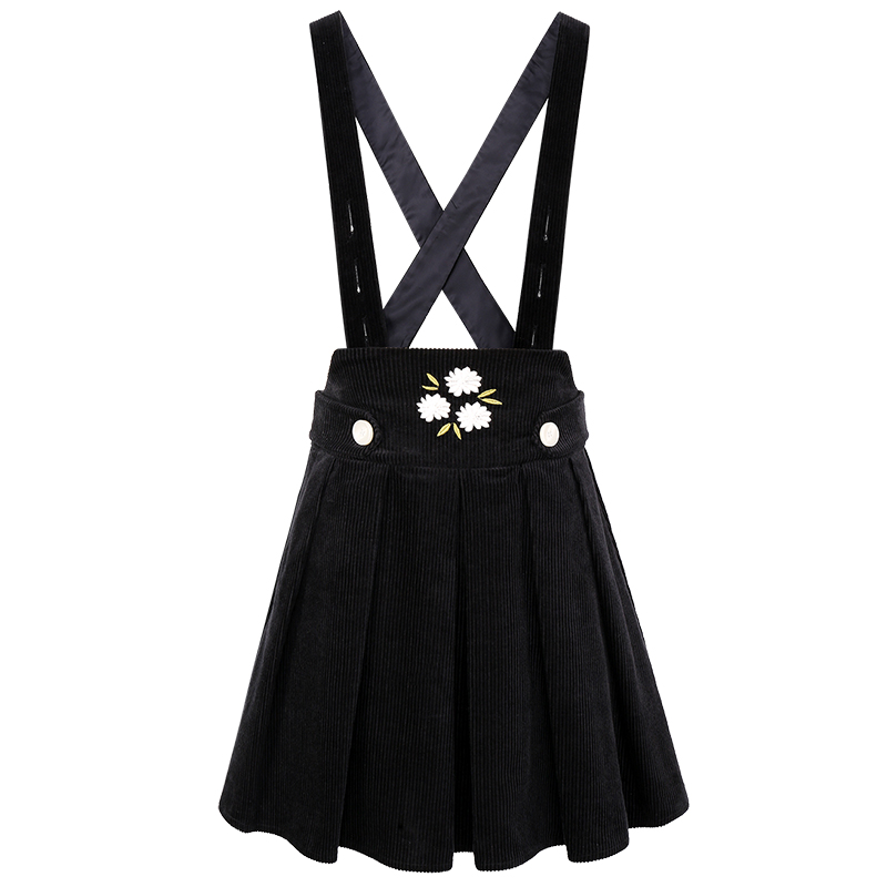 MG小象復古高腰背帶裙女秋冬2018新款繡花燈芯絨黑色百褶連衣裙潮