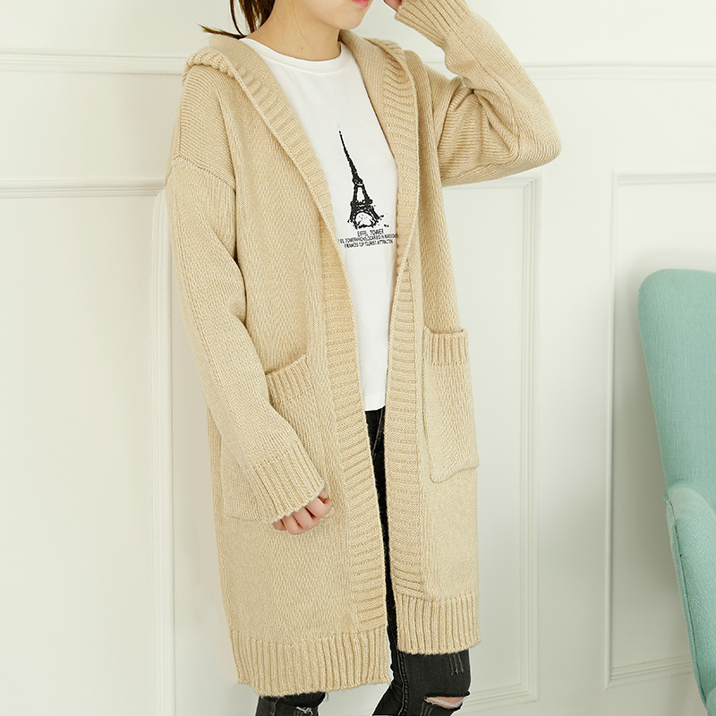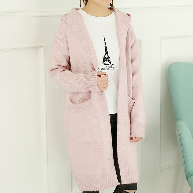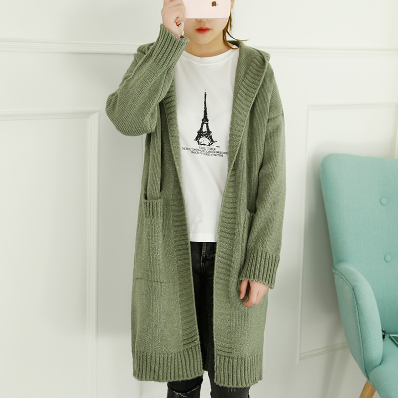 / 春裝新款女毛衣開衫韓版寬松中長款連帽針織衫純色外套女裝潮
