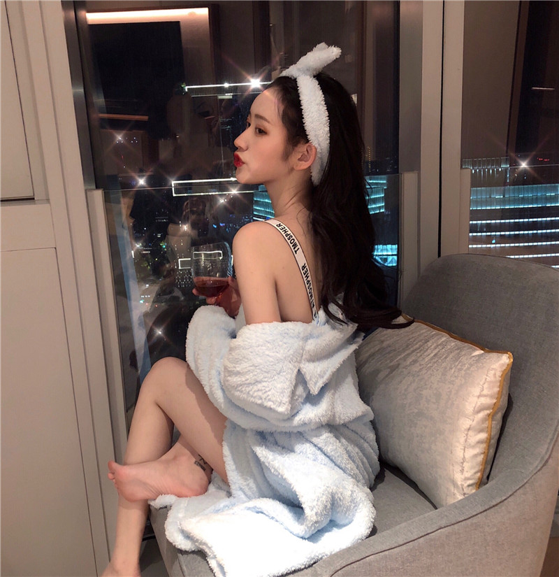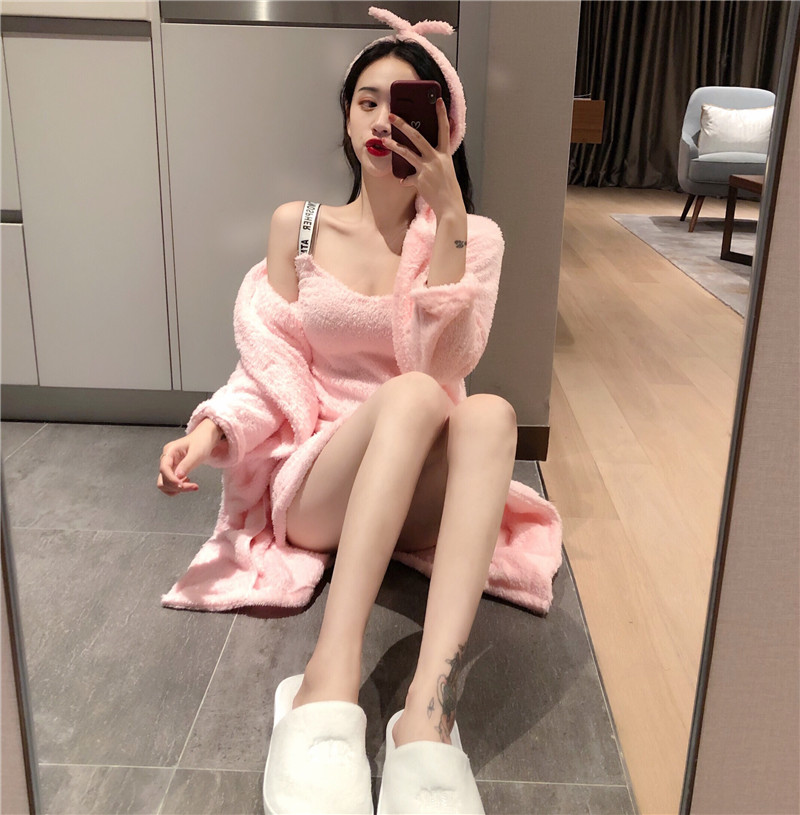 2018新款復古性感睡衣女秋冬外套加吊帶發帶保暖純色家居服套裝潮