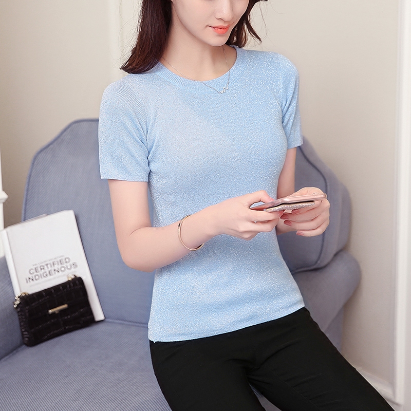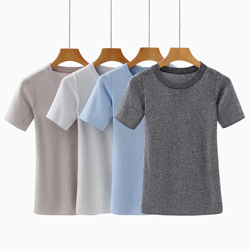 / 亮絲打底衫女短袖薄款修身上衣女新款韓版百搭針織t恤女夏季