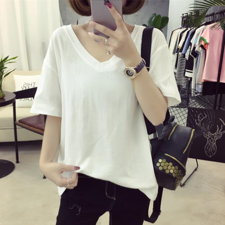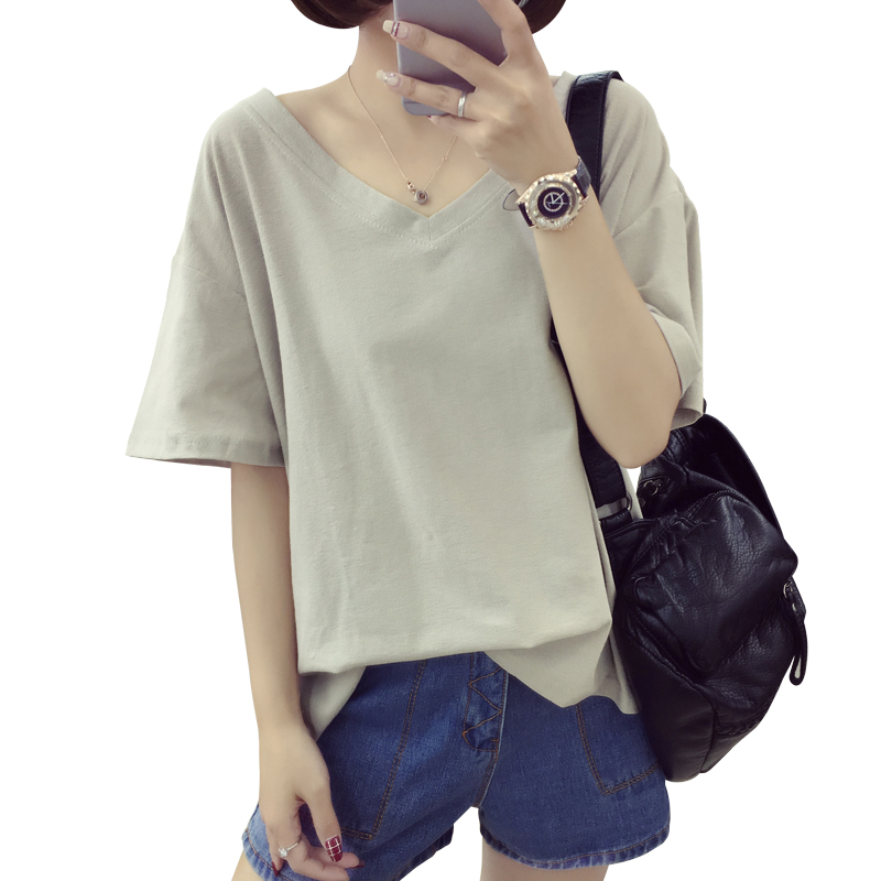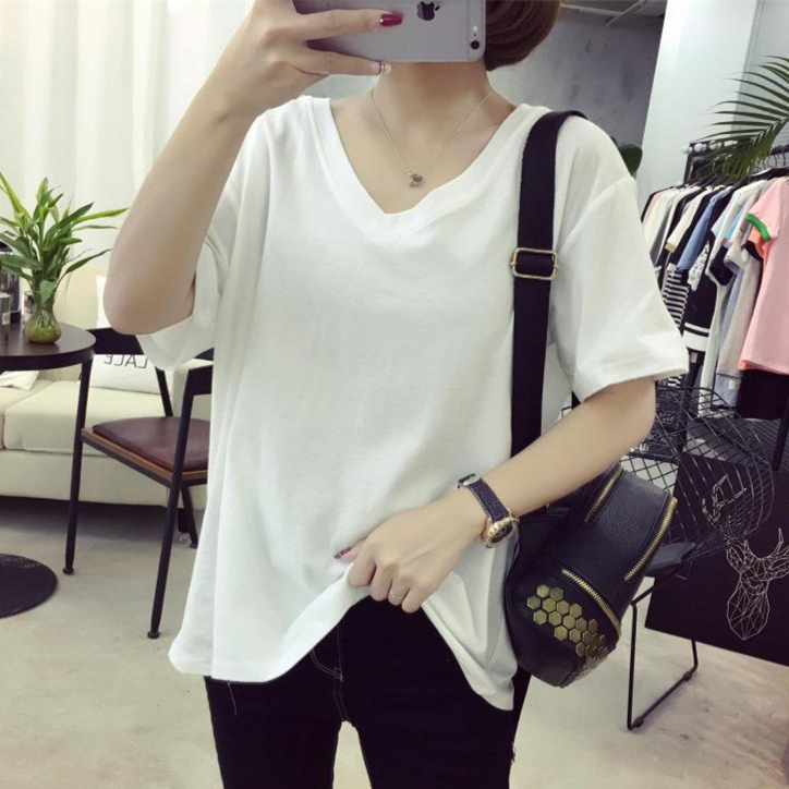 / 女裝短袖上衣女寬松韓版夏季純色百搭大碼T恤女胖MM休閑V領半袖潮