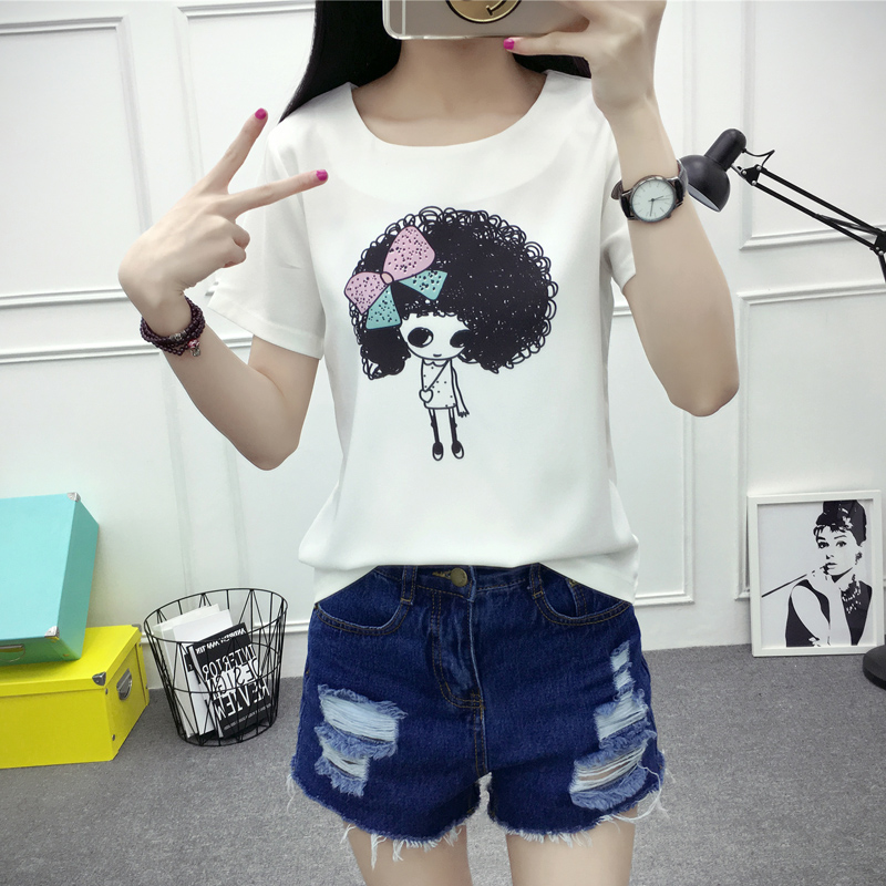 夏季新款雪紡衫短袖T恤女韓版寬松大碼百搭學生印花雪紡上衣