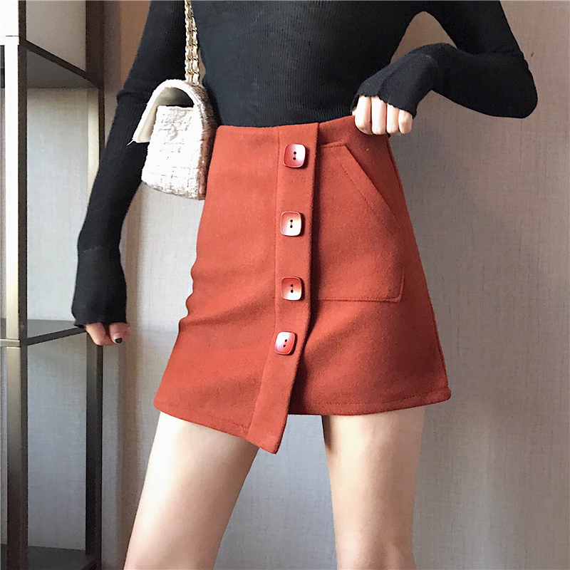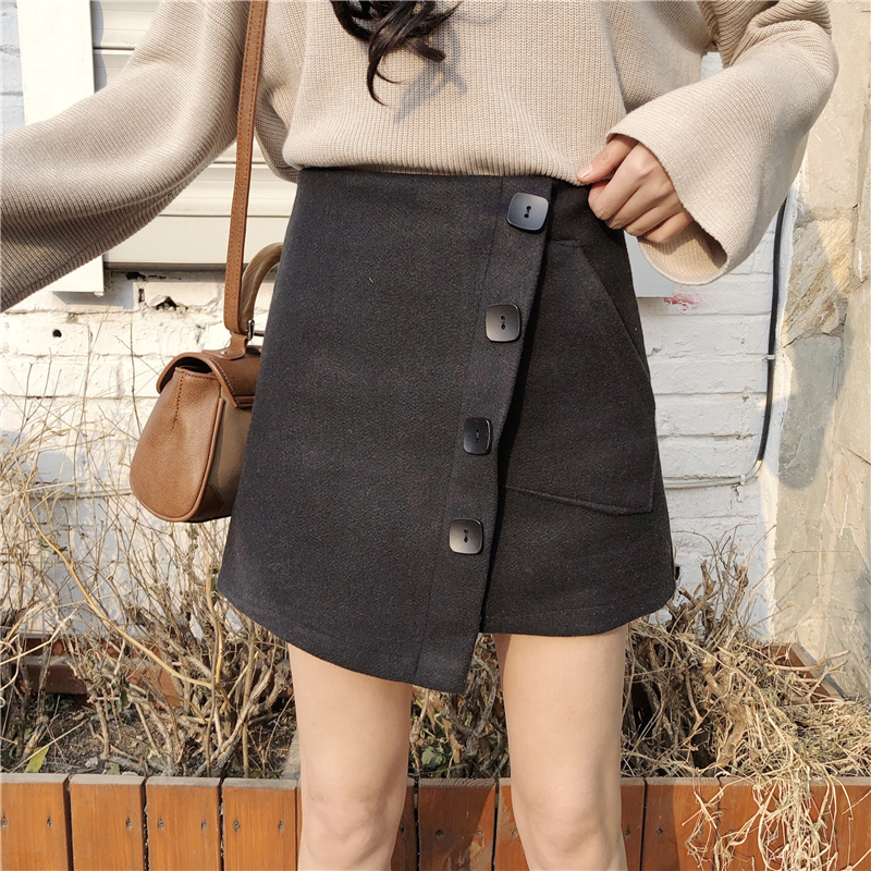 / 裙子女新款韓版百搭chic時尚復古顯瘦不規則毛呢短裙單排扣半身裙