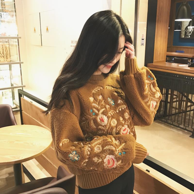 冬款韓國復古chic重工復古花朵刺繡保暖羊羔毛長袖套頭衛衣女
