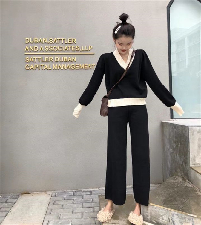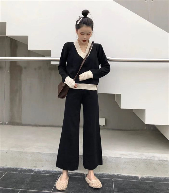/ 新款韓版拼色V領寬松針織衫上衣時尚套裝高腰闊腿休閑褲兩件套女