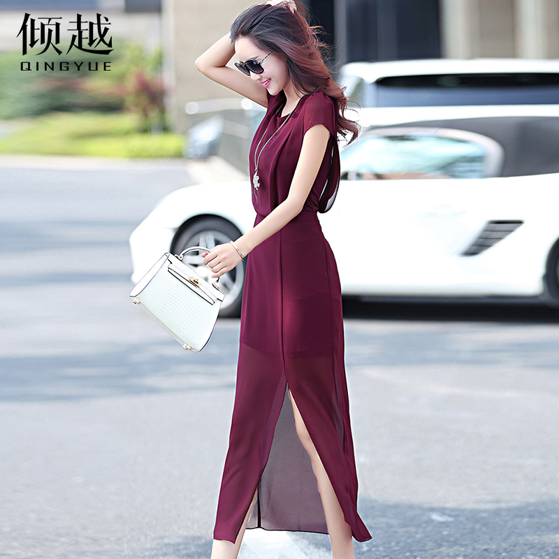 / 傾越雪紡長裙修身短袖2017夏裝新款女士長款包臀連衣裙開叉一步裙