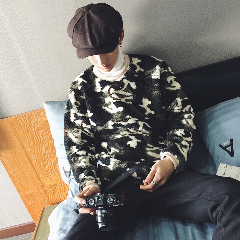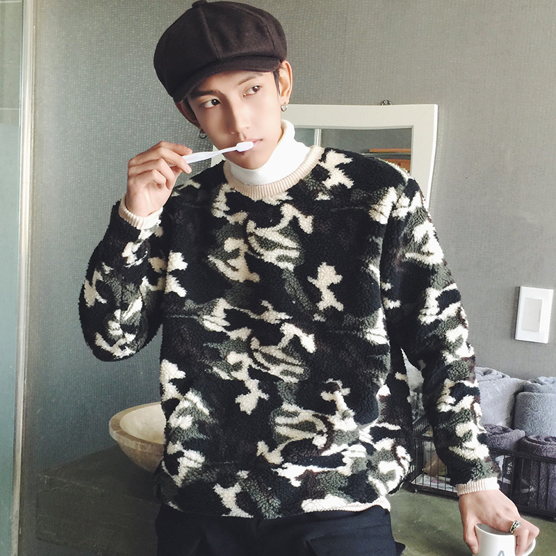 男裝韓版迷彩提花撞色加厚寬松男士套頭針織衫毛衣